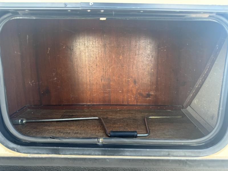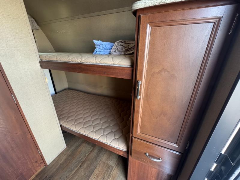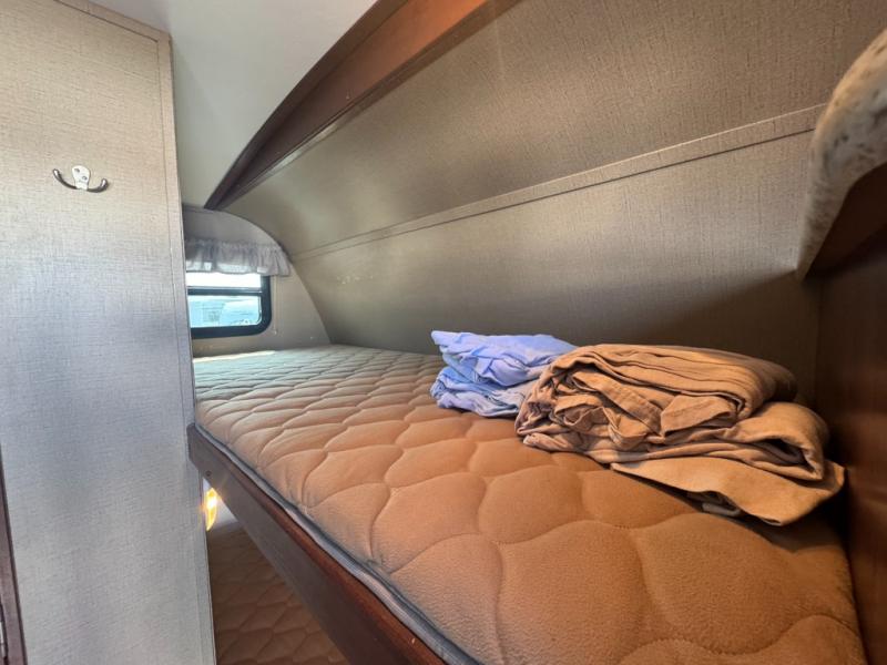 Step inside using either of the two side entry doors. The door up front leads you to the bath and front set of bunk beds. There are also two wardrobes, one at the foot of the bunk beds and a second smaller one just inside the door to your left with a TV shelf above it.