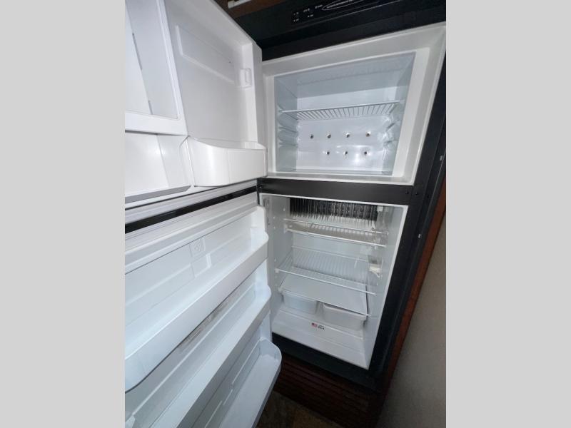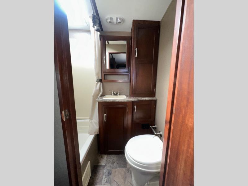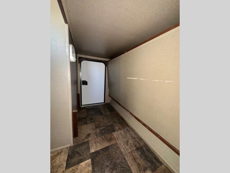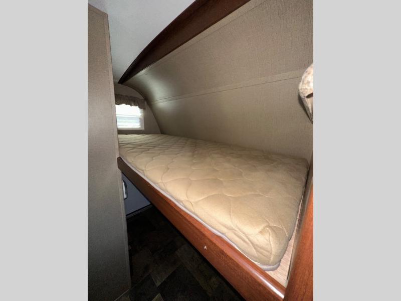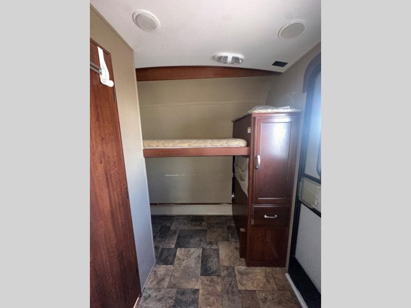 As you step inside you will notice the convenient bath located straight ahead and a set of bunk beds to your right. The bunks are 34" x 74" and there is also a wardrobe at the foot just inside the entry door.