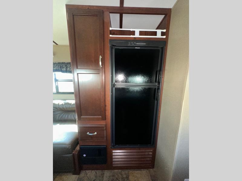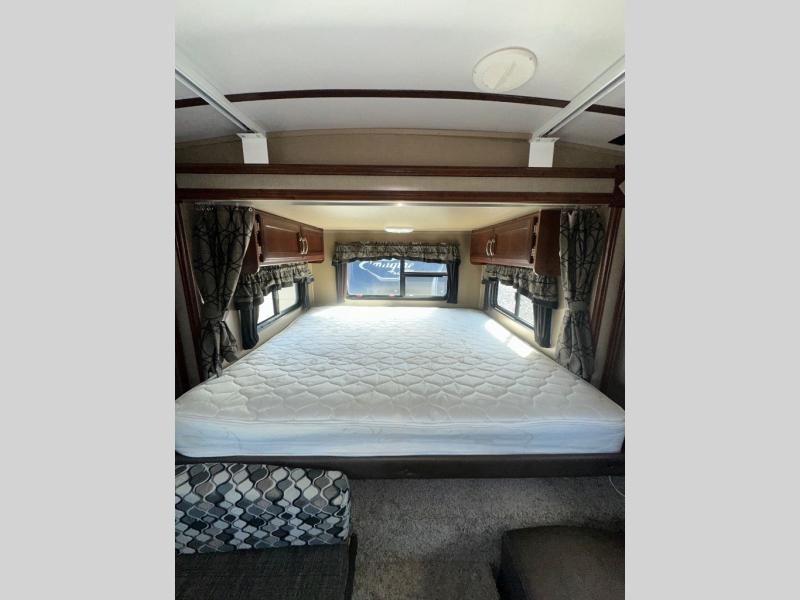Step up in back to the rear slide-out king bed including overhead storage in front, and exterior storage on either side of the rear slide. You can also find bicycle storage in front below the bunk beds and much more!