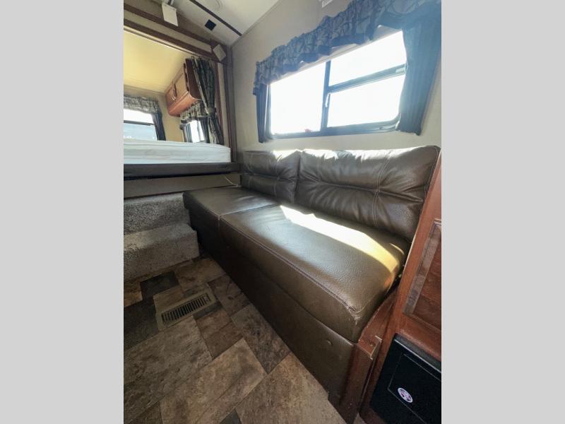 Moving toward the back you will see plenty of seating with a sofa on your right and a booth dinette on your left. There is also a 32" HDTV mounted above the dinette area for your enjoyment.