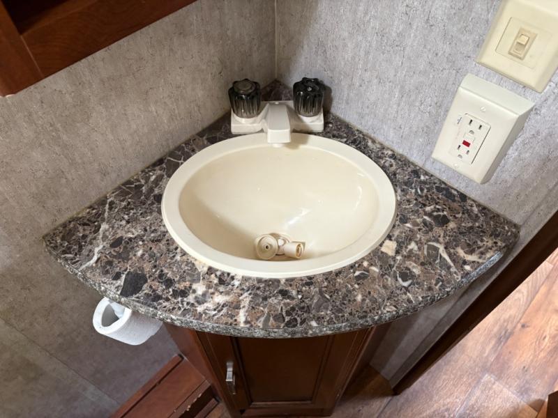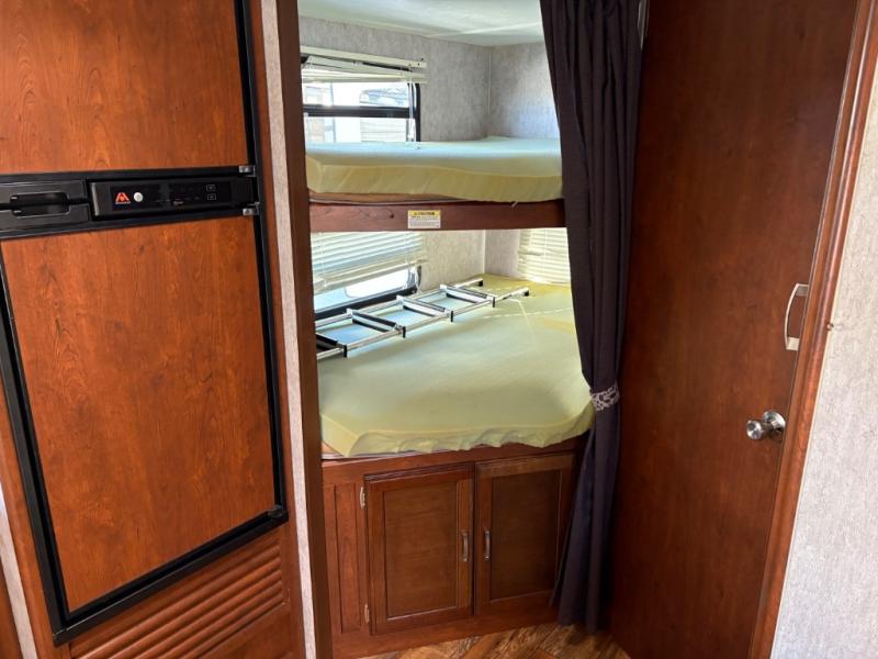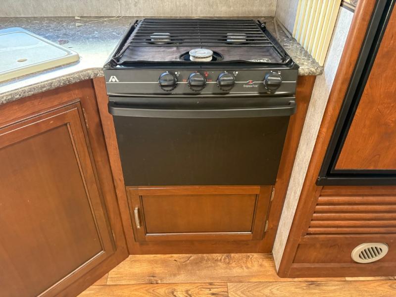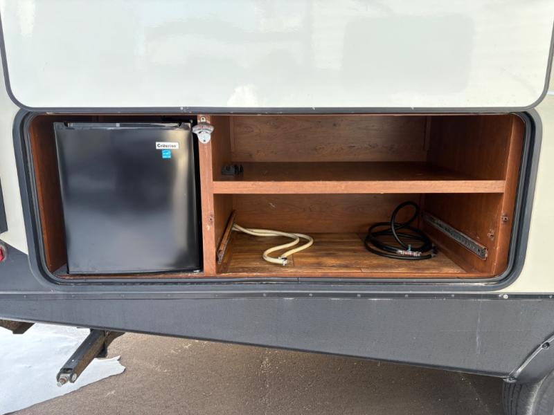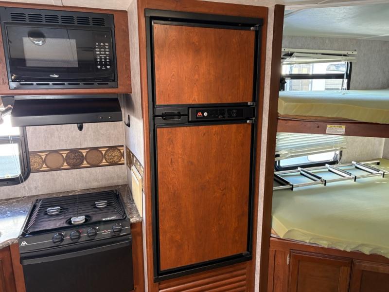 There is an outside kitchen beneath the bunk area that is a perfect feature for those who enjoy cooking and dining outside. Here you will find a refrigerator, sink, and two burner cook-top.