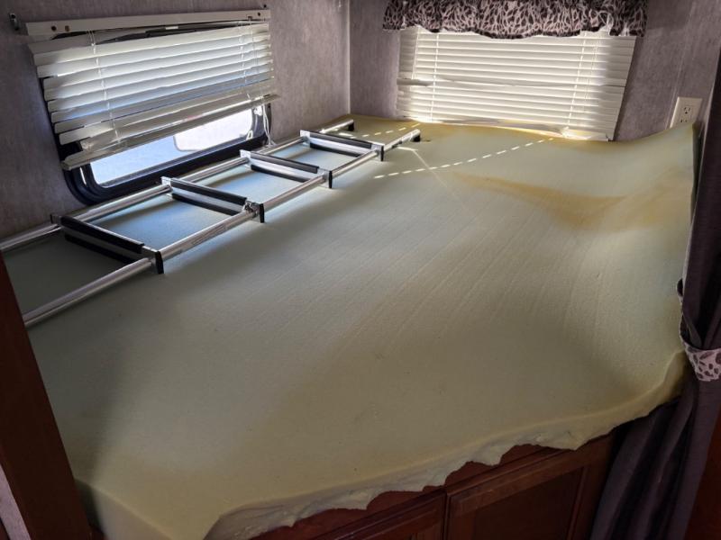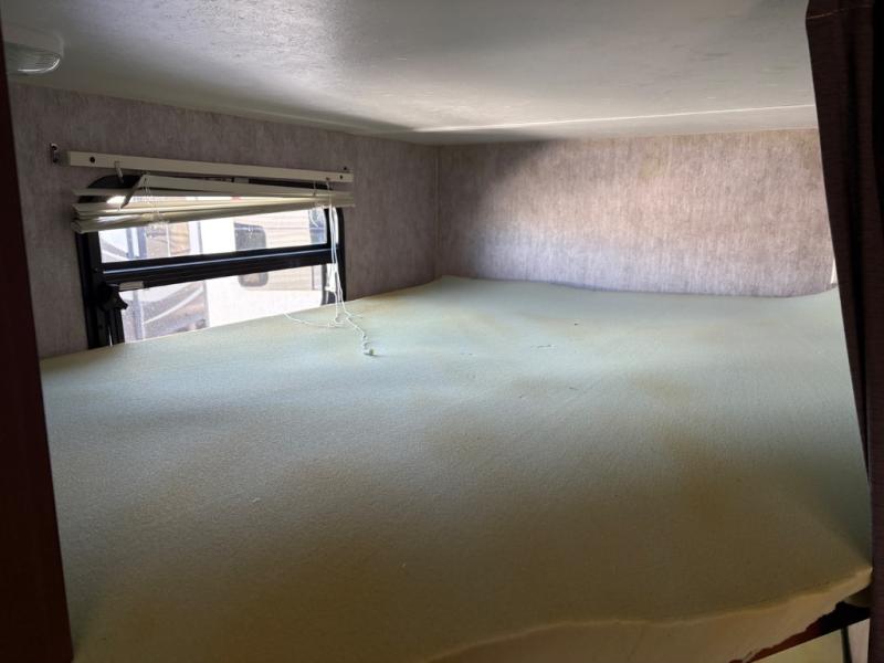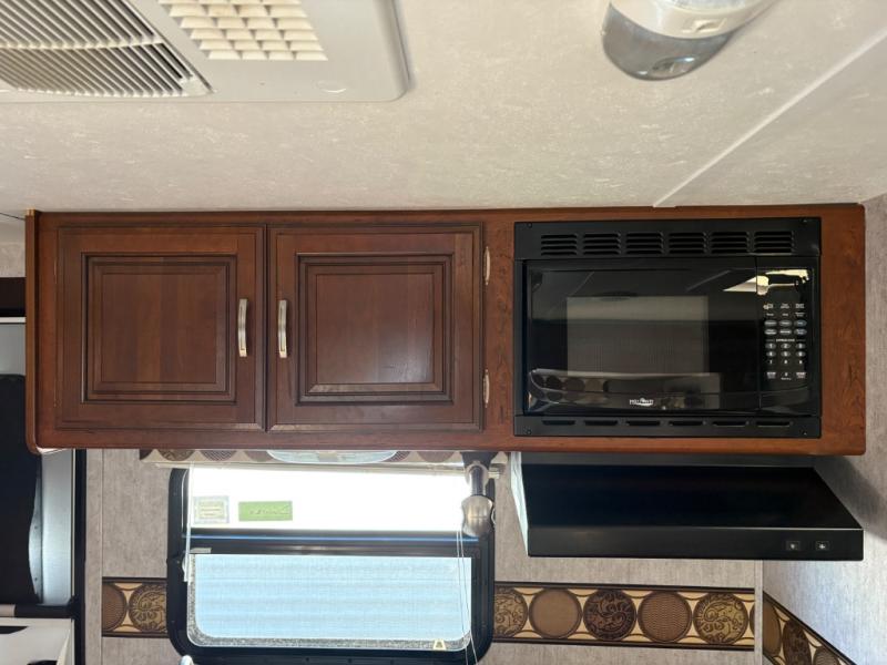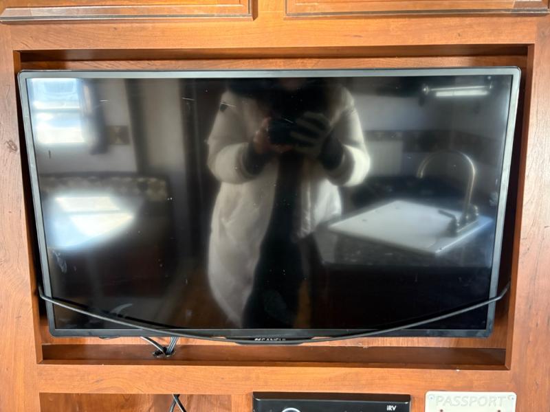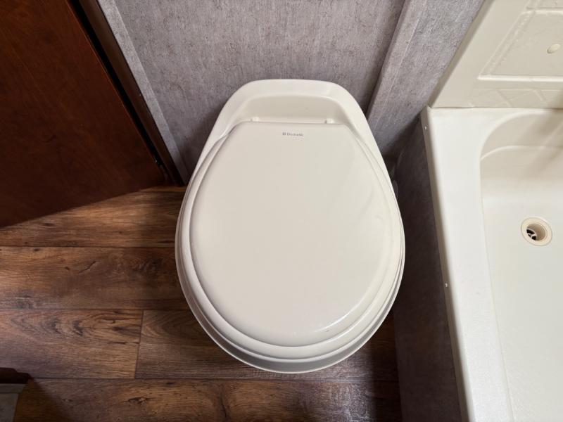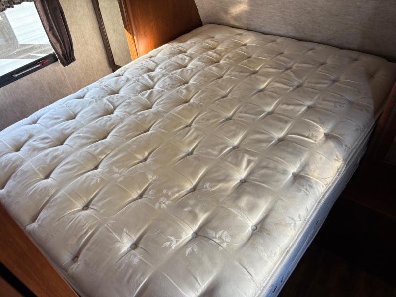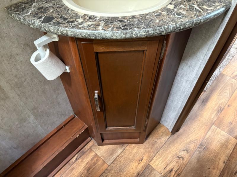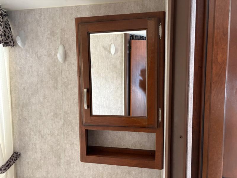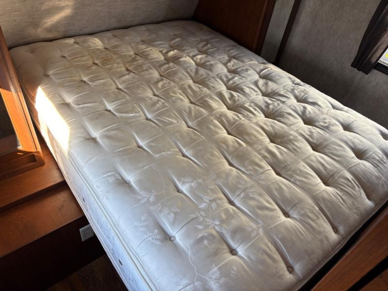 Step inside and notice the front queen size bed to your immediate right. There are two wardrobes for storage, and an overhead cabinet above. There are pocket doors that can be pulled closed to provide more privacy at night on either side of the living room entertainment center.