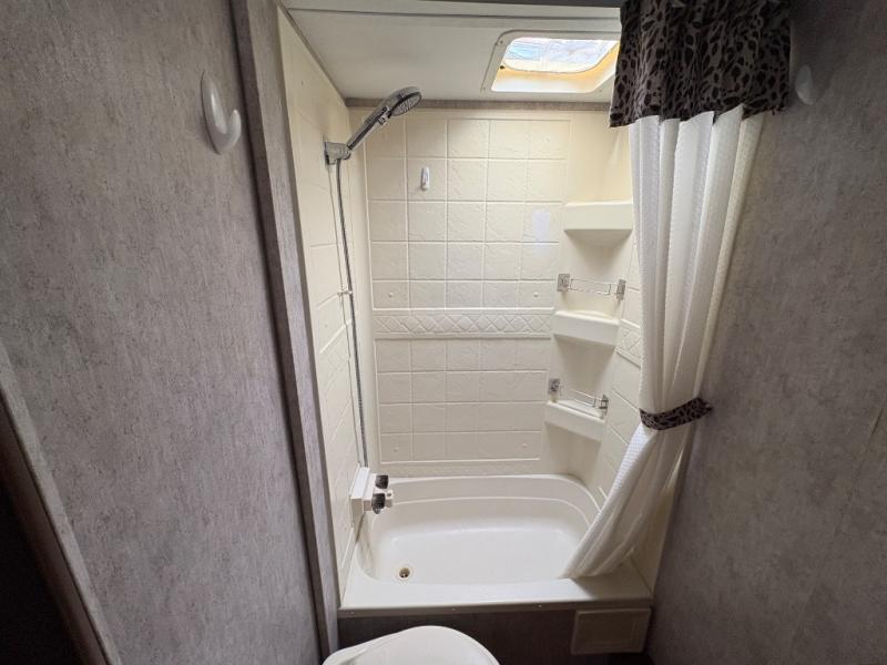 The left rear corner features a double bed set of bunks. The right side features a bath with tub/shower, toilet, and sink.