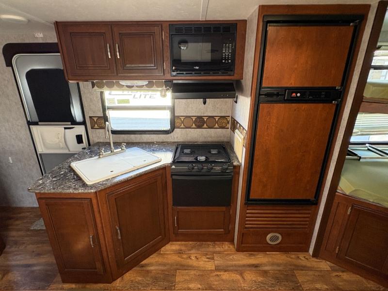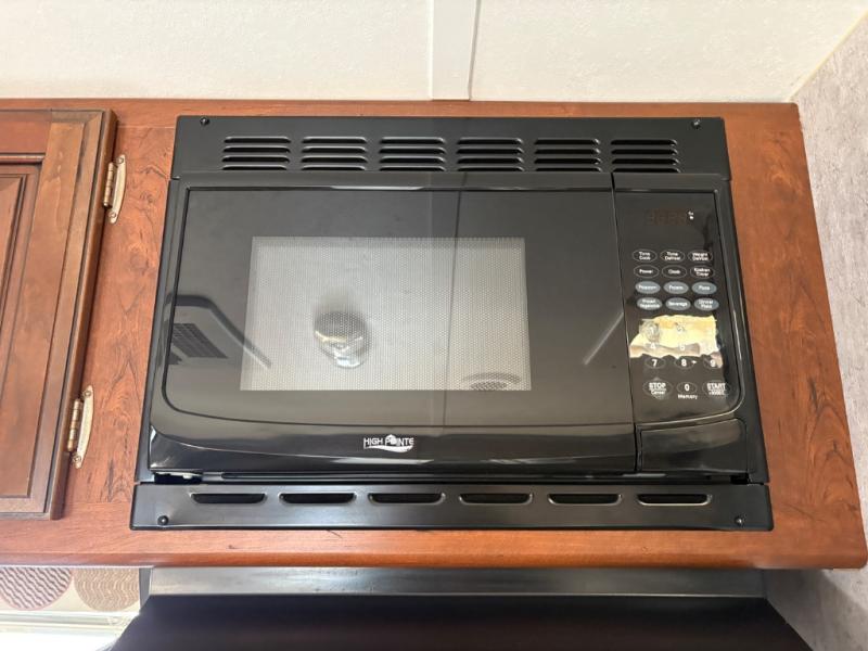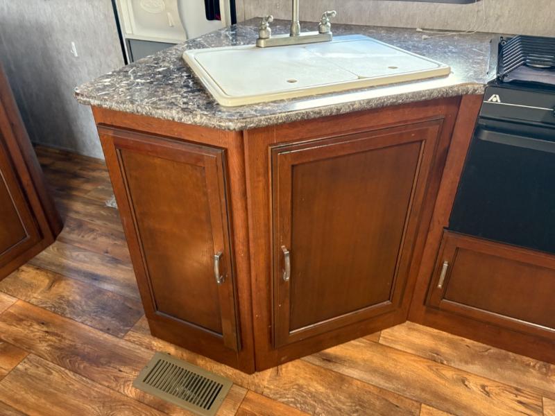 The kitchen provides a refrigerator, a three burner range, and double kitchen sink for easy cleanup. The overhead cabinet and lower cupboard and drawers will give you space for dishes and things. There is also a pantry on the opposite side next to the slide-out u-shaped dinette.