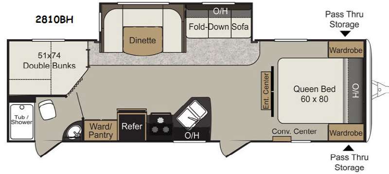 This Passport Grand Touring model 2810BH features double bed bunks, dual entry doors, and a large slide out for added interior space.