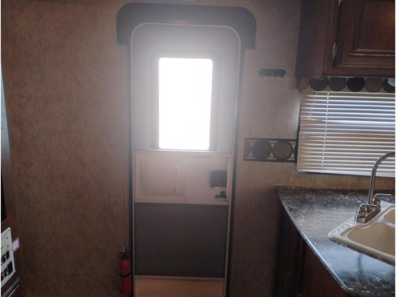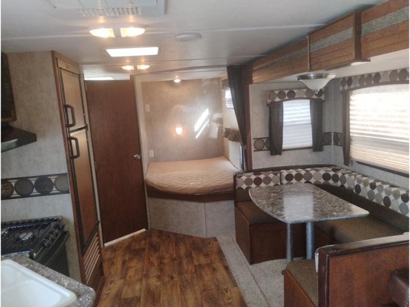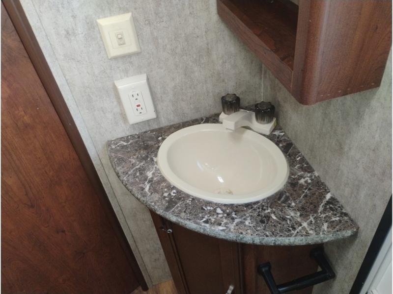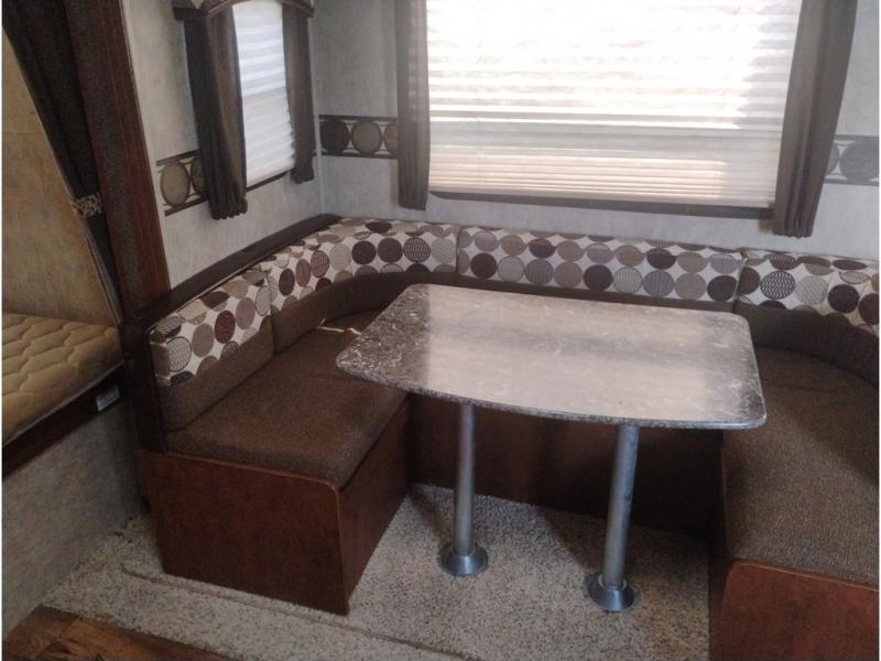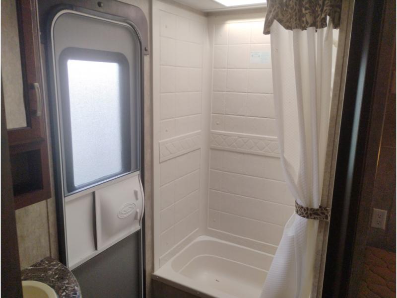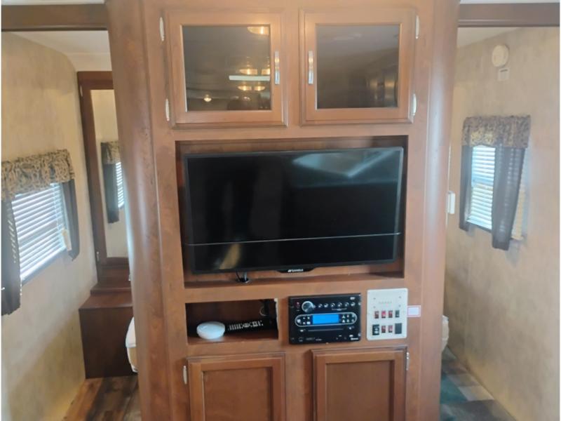 The entertainment center is centrally located in the main living space and can be easily viewed by any seating in the room. There is a large slide out u-shaped dinette for mealtime, and a fold down sofa for added seating, plus each can be quickly made into more sleeping space at night if needed. The sofa also offers overhead storage.
