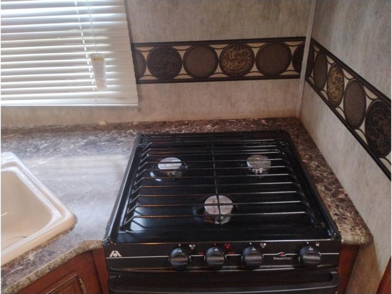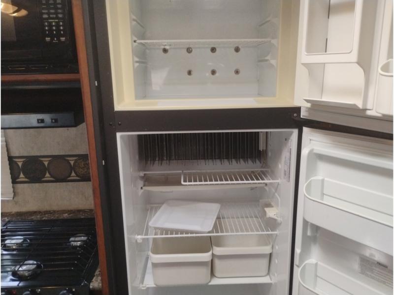The kitchen features a refrigerator, three burner range, and overhead cabinets for dishes. A wardrobe/pantry provides more storage for canned items and dry good storage as well. Plus there is a double kitchen sink which makes cleaning up a breeze.