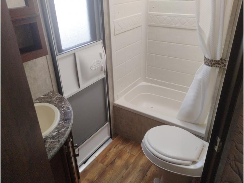The opposite rear corner features a bath with private entry and includes a tub/shower, toilet, sink, and so much more!