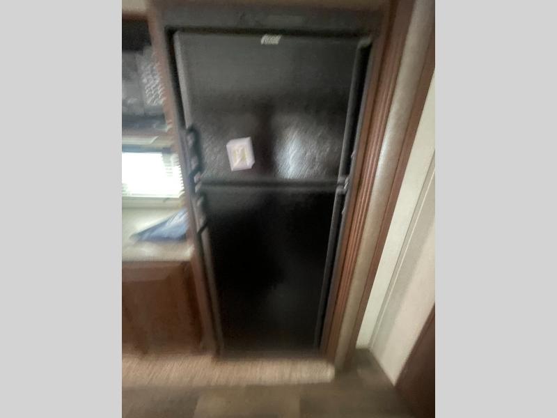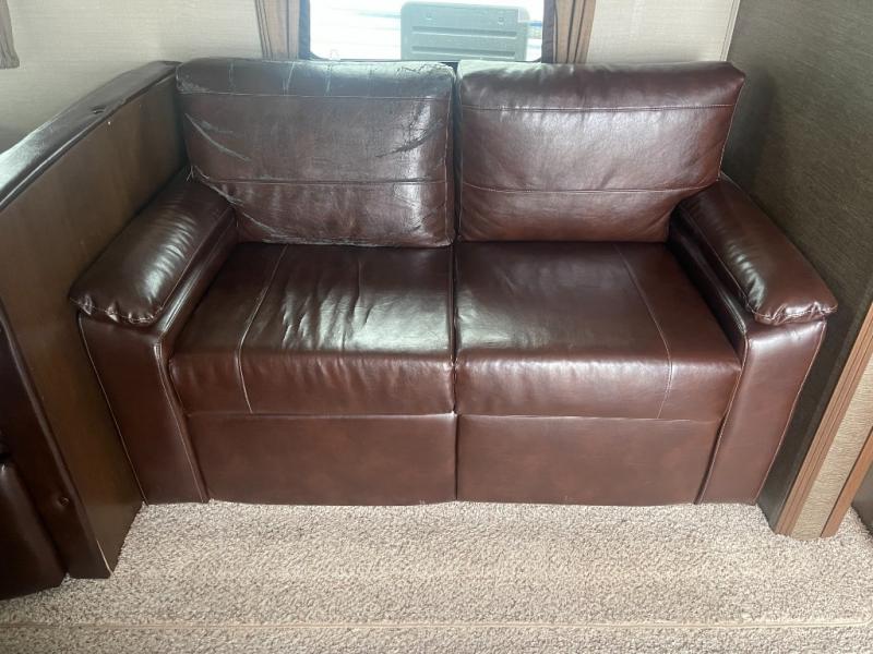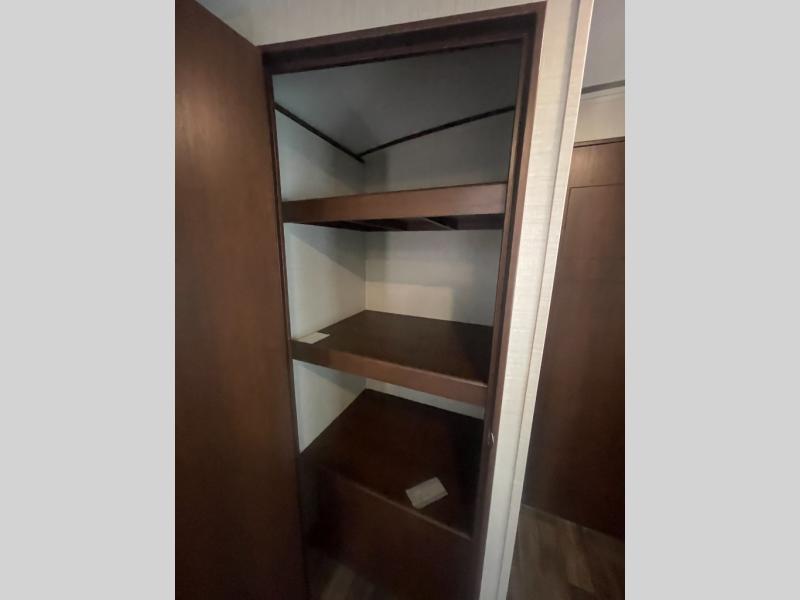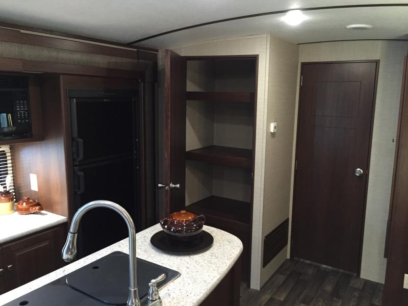 As you enter you will notice how open this unit feels with the combined kitchen and living space including two slides opposite one another. To the left of the entrance there is a three burner range, counter area with overhead cabinet, and refrigerator. A large pantry off to the side provides ample space for storing dry goods and more. There is also a convenient kitchen island with added counter space and a double sink that will make cleanup a cinch.