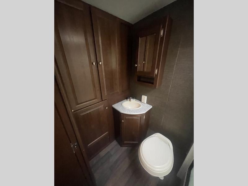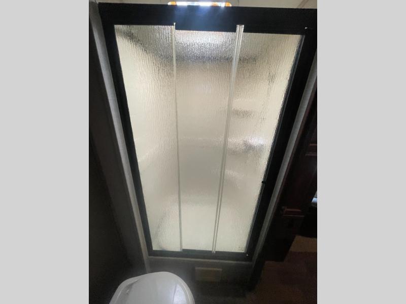 In the very back of this Premier unit you will find a compete bath with 30" x 36" shower including a glass door, toilet and sink, plus a large linen cabinet for toiletries and more.