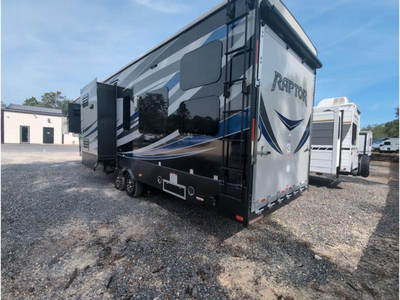 This Raptor fifth wheel toy hauler 375TS by Keystone RV has everything you need to enjoy camping with family, friends, and a few toys! This unit features triple slides, one and a half baths, a twin loft above the garage space, and a king size bed!