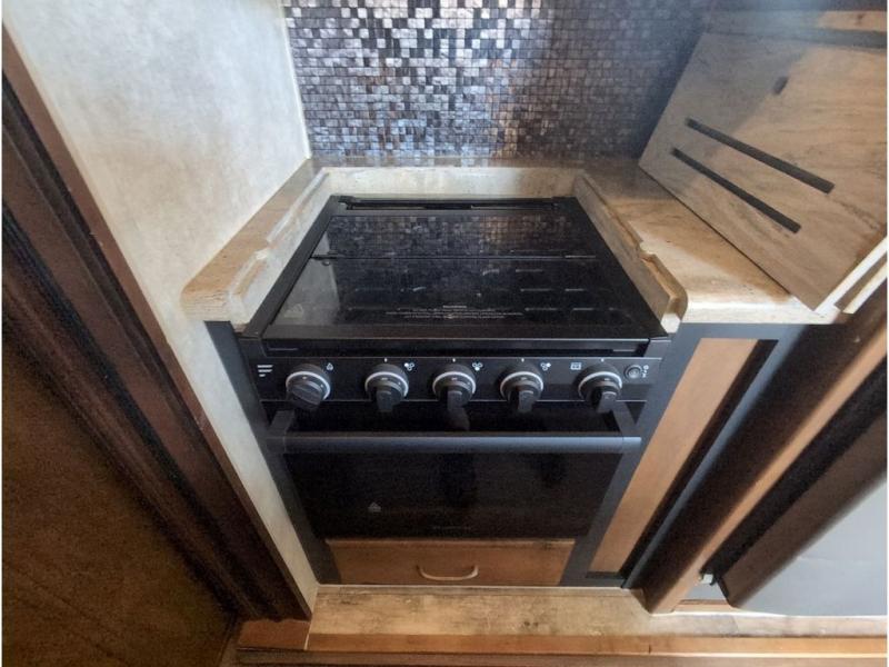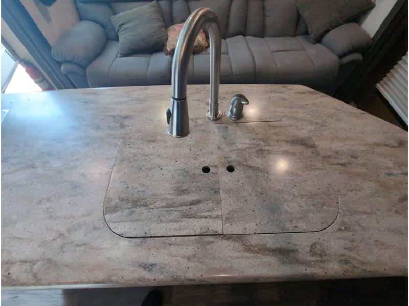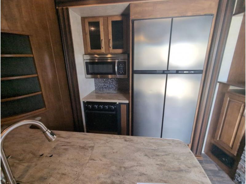 On the side opposite the door you will see a kitchen which features a slide out three burner range, 18 cu. ft. refrigerator, large counter-top with trash can storage plus double sink. There is also a pantry for more storage.