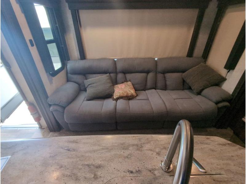 Enter the main living area where you will find a slide out 97" sofa with recliners and overhead cabinets. There is also a dinette table for mealtime use.