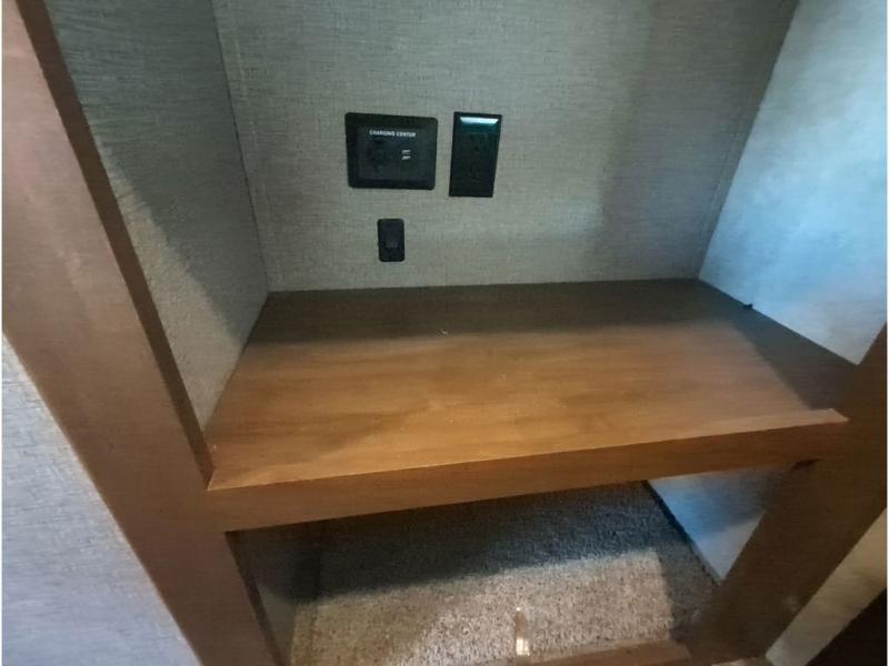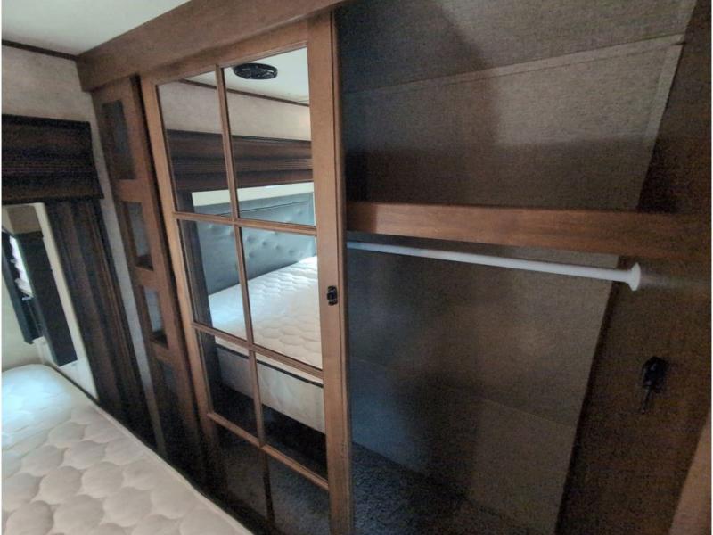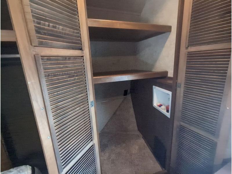 Head up the steps to a side aisle bath featuring a tub/shower, toilet, and vanity with sink. Continue down the hall which leads to a private front bedroom that offers a king bed slide, dresser with entertainment center above, full front wall wardrobes and a small wardrobe with washer/dryer prep, and so much more!