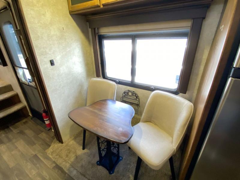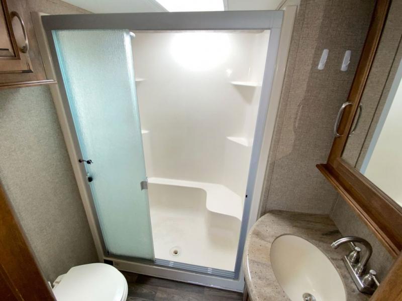 Inside the main living and kitchen area combined there are two opposing slides which creates a bit more space. A pantry to the left of the sliding glass doors and slide-out three burner range, counter peninsula with large sink, and L-shaped hide-a-bed with recliner combined. An entertainment center is located on the interior living room wall for your enjoyment.