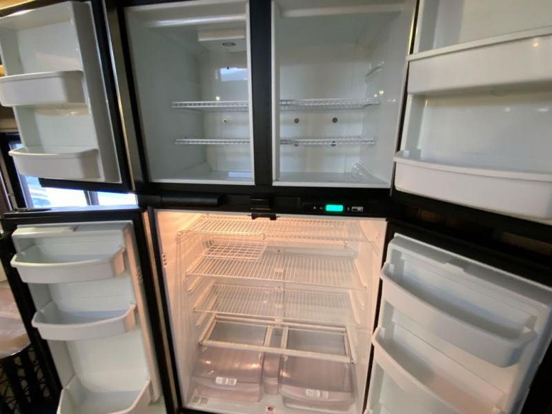 On the opposite side of the room there are dual recliners together, a 18 cu. ft. refrigerator, and a second pantry slide out.