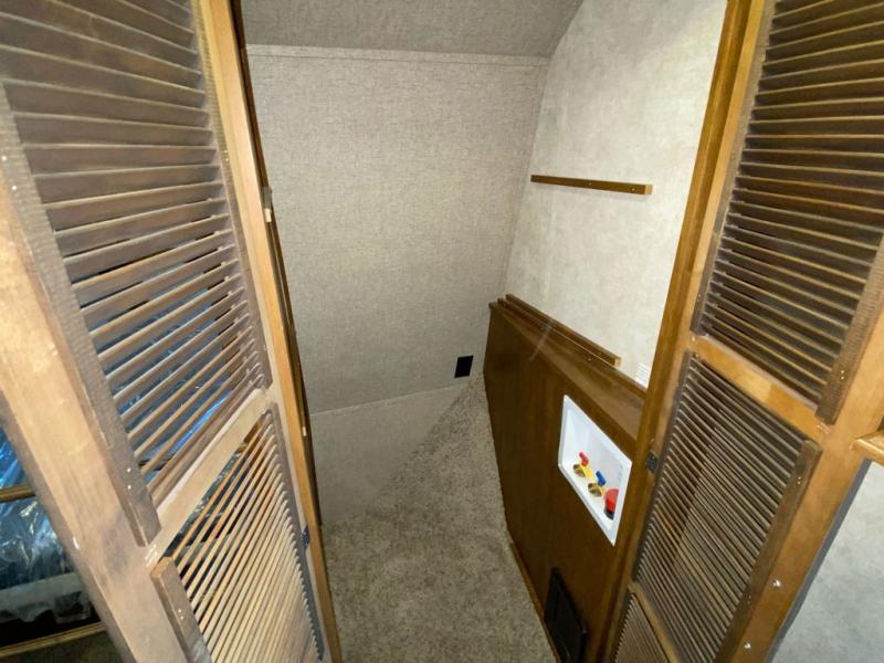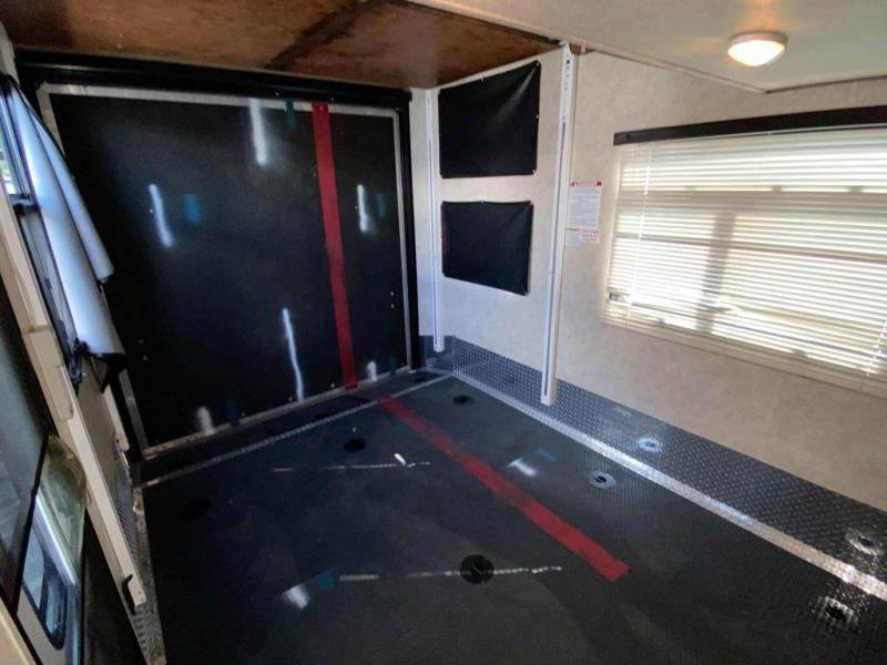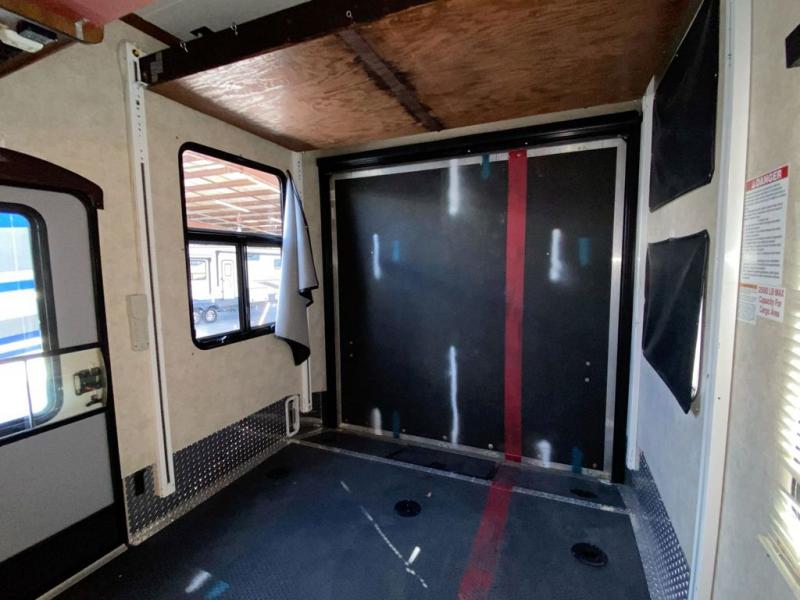Step inside the garage space using the rear ramp door. You can see that loading would be a cinch. There is a side man door in the garage for easy access when the ramp door is closed and a sliding glass patio door to the main living space making it easy to open things up when the toys are removed. There is a twin loft bed above the garage that the kids will surely love, and an electric bed with dual opposing sofas in the rear for more sleeping space at night and lounging during the day.