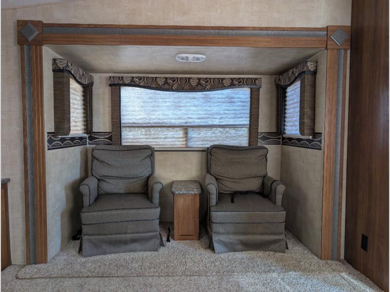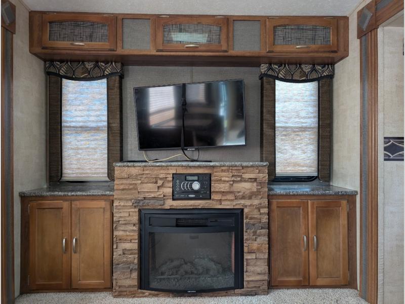The rear wall offers a full entertainment area with 39" LCD TV, storage, and fireplace with back-lit surround. Continue around the back side to a second slide out that features two recliners and an end table between.