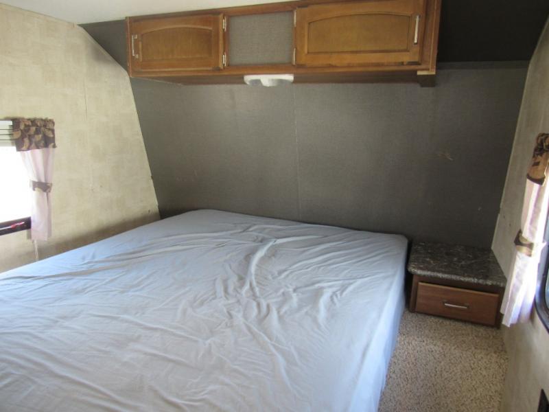 The front area features a queen size bed for a comfortable nights rest along with closets on both sides of the bed including nightstands. A curtain can be pulled at night to give you a bit more privacy if you like.