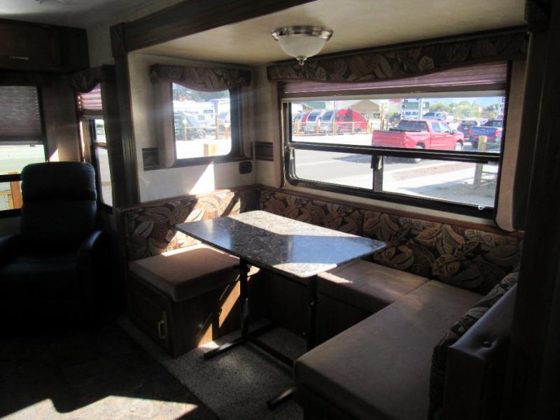 There is a u-shaped dinette slide opposite the door for added walking around space inside. There is also an entertainment center nearby for your enjoyment.