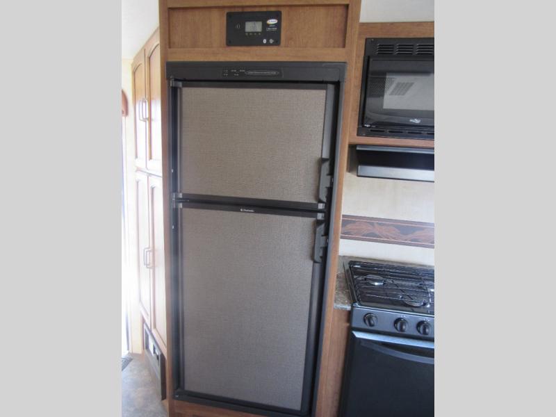 The kitchen provides everything you need to cook food for your family while away from home. There is a refrigerator, three burner range, overhead microwave oven, and corner pantry. There is also plenty of storage both above and below the counter tops also.