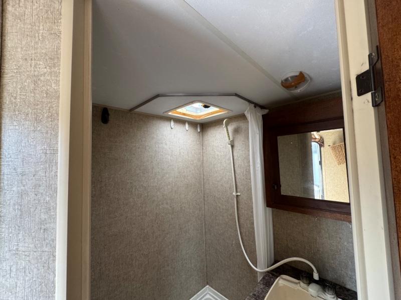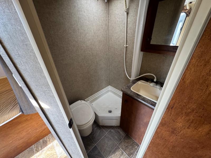 As you enter the expandable, in the rear you will find the bathroom. Inside the bathroom there is a toilet, corner shower, and sink.