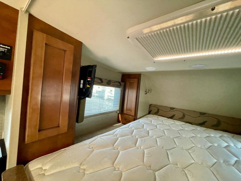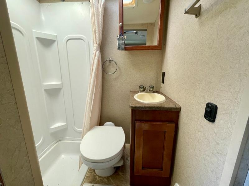 The front bed area is a step up from the rest of the camper and features a queen size bed with pillow-top innerspring mattress. Enjoy storage in the rear right corner and front left. There is also a hamper for your dirty clothes along the right side. In the rear left corner find a entertainment center where you can choose to add the optional 24" 12 volt LED TV for enjoyment when inside hanging out.