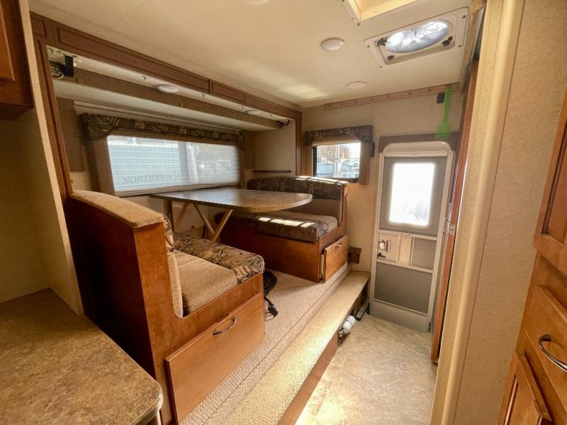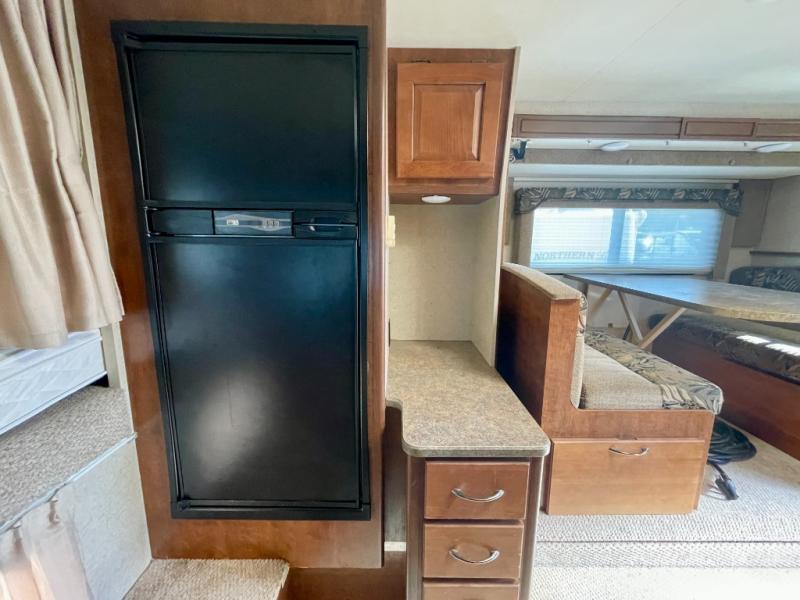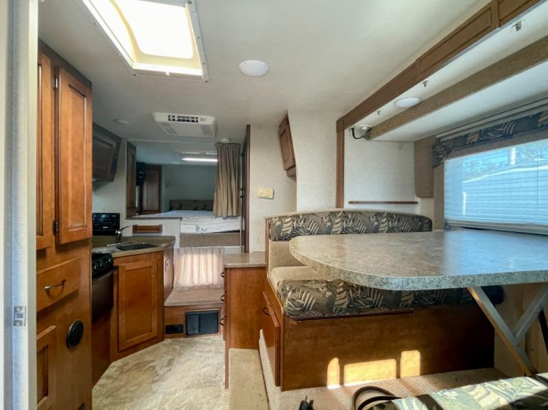 Step inside and see the extra floor space that having a slide out provides. The dinette slide easily gives you more interior walking around space and comfortably seats everyone during mealtimes, and also provides additional sleeping at night if needed. There are also two storage drawers in the dinette seats to neatly tuck things away.