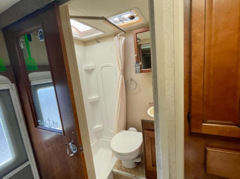 The rear corner bath just to the left of the entry door features a toilet, sink and tub/shower with skylight and fan. There is also a medicine cabinet above the sink which features storage and a mirror.