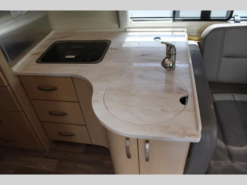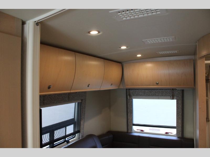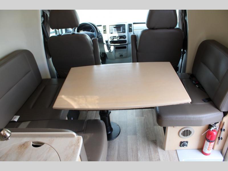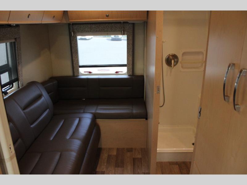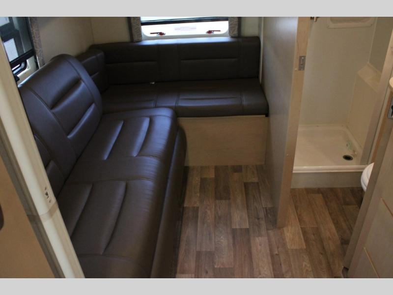 You will enjoy plenty of seating with a belted chair to the right of the door, the passenger and driver seats swivel to the back when parked, and there is an L-shaped bench behind the driver's seat for plenty of space to enjoy meals and conversation with a pedestal table between.