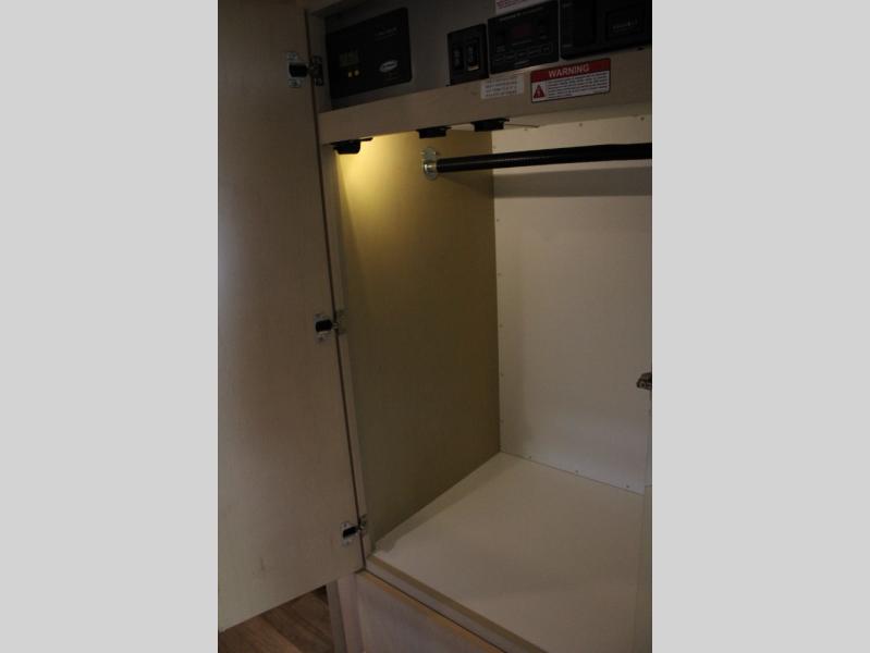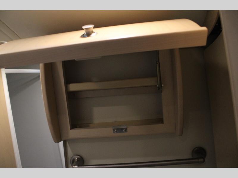 There is a larger wardrobe just beyond the kitchen area for hanging clothes, and a swing arm TV on the opposite side for viewing pleasure.