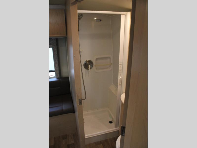 The rear left corner offers a standard 54" x 80" bed with storage across the head of it, and along the curb side wall. The right rear corner features a complete bath with shower, sink, toilet, and storage, plus so much more!