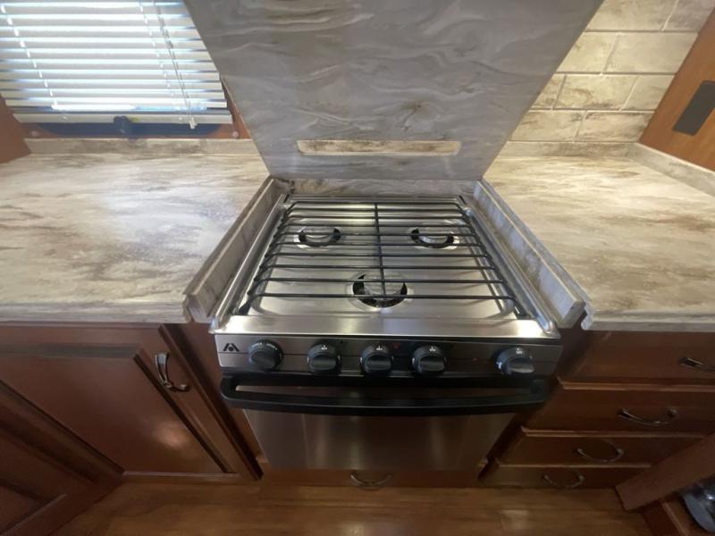 Step inside the entry door and be greeted by a spacious dining area. There are double slides opposite one another with a dinette and two recliners on the entry side. Enjoy a convenient kitchen island in the center of the room with a spacious counter top and double sink. The slide opposite has everything you need to create family meals, snacks, and more. There is a pantry for storage along the interior wall, plus a convenient coat closet too. Within the slide out you will find a refrigerator and three burner range with a microwave oven above. There is also plenty of overhead storage cabinets and counter space for cooking and food prep. An appliance garage and a pull-out desk with entertainment center completes the large slide opposite the door.