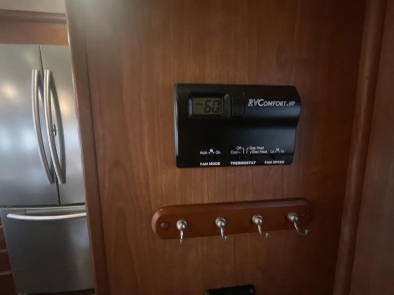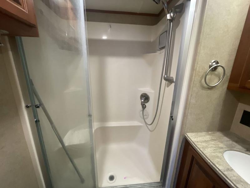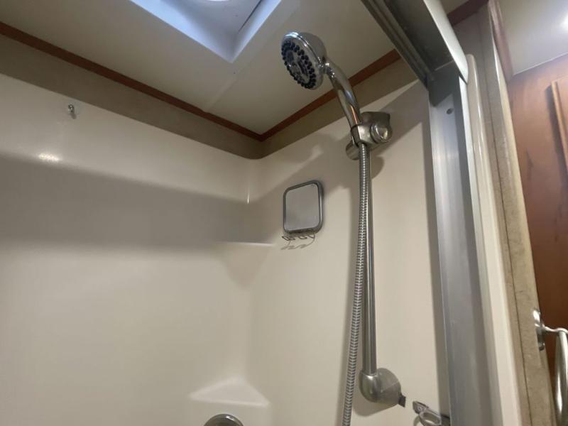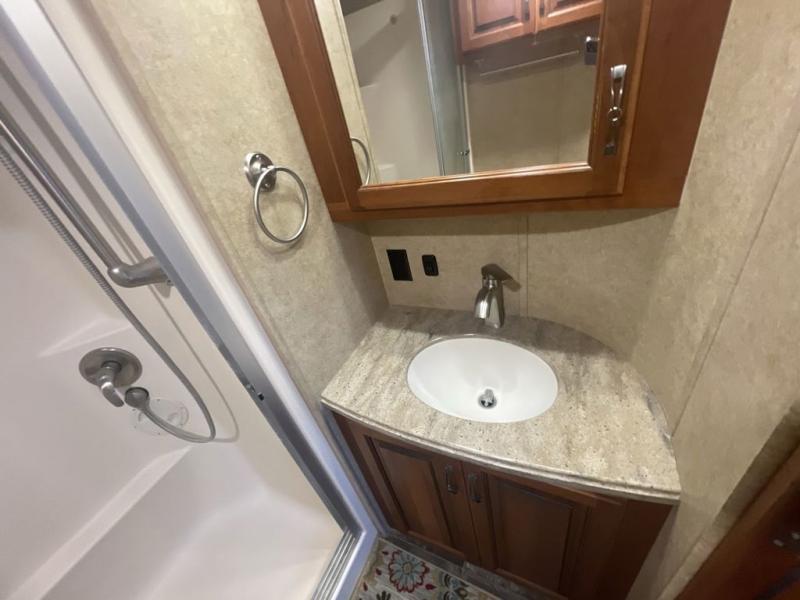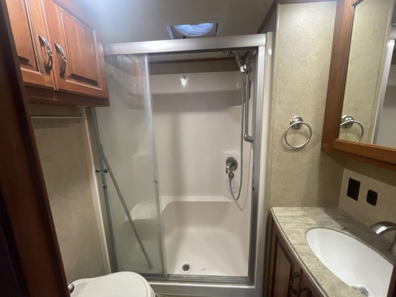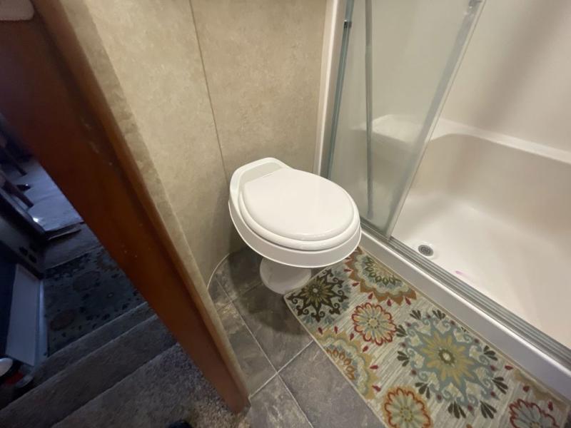 To the right of the entry door you can step up to a side aisle bath with residential shower, toilet, and sink with medicine cabinet.