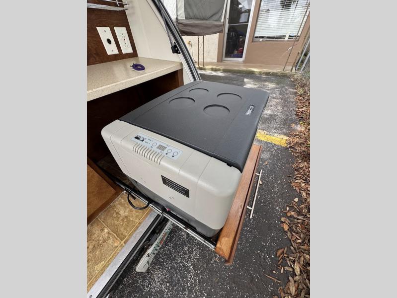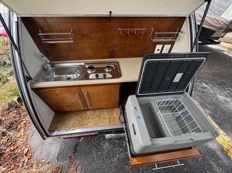 The TAG Basic teardrop trailer by Little Guy features a full galley in the rear with a sink and stove combo. The galley has an optional fridge/freezer. It includes a 3-speed dual directional roof vent that ensures adequate ventilation.