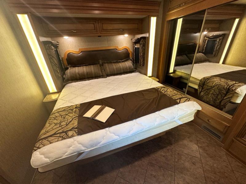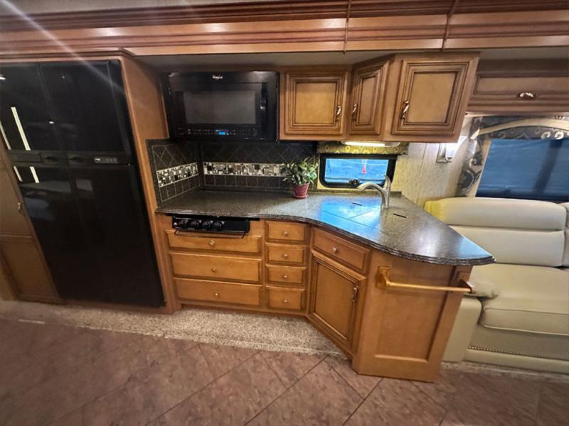 The wall slide has a jack-knife sofa, double kitchen sink, three burner range, refrigerator, pantry, linen cabinet, two shirt wardrobes, a chest of drawers, and an overhead TV.