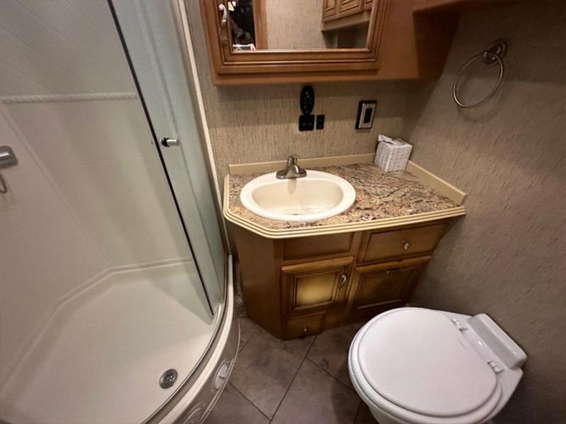 The bathroom has a toilet, sink, and corner shower.
