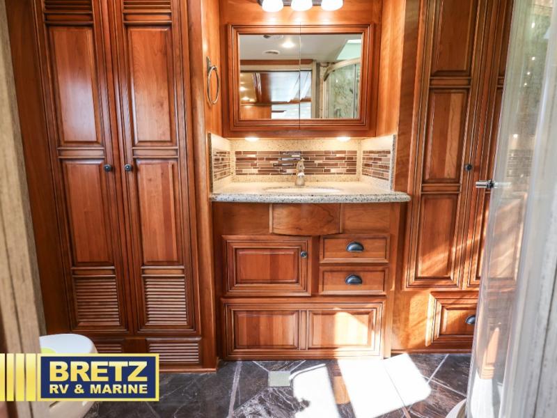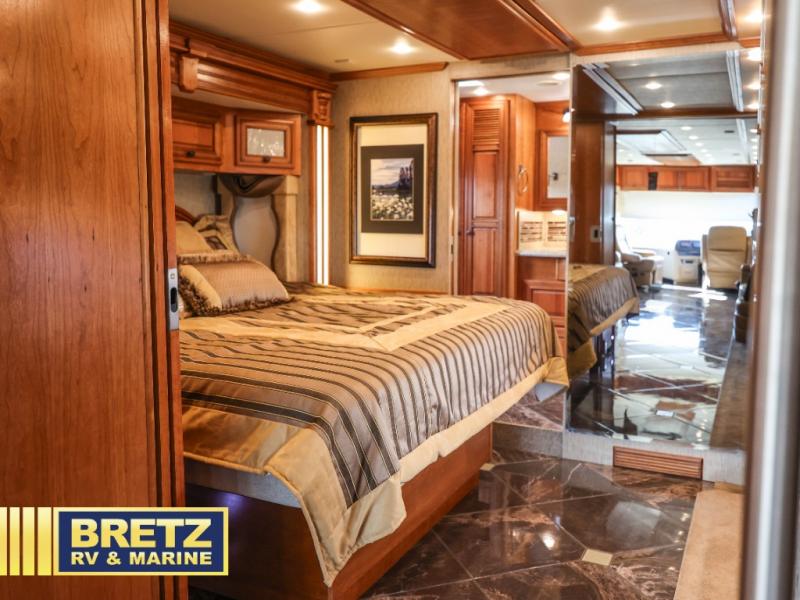 The rear bedroom offers a king bed slide. In the very rear of the motor home you will find a large master bath with a toilet, two wardrobes, sink, and corner shower. The full wall slide has two wardrobes, a chest of drawers, overhead TV, pantry, refrigerator, hide-a-leaf dinette, recliner, fireplace, and LED TV.