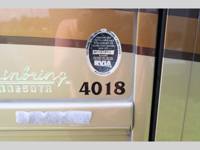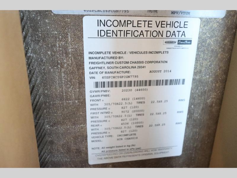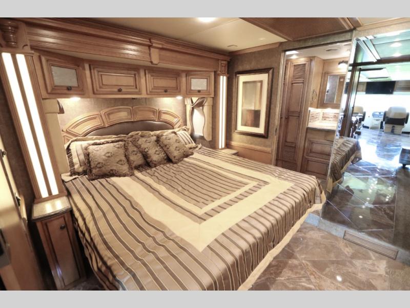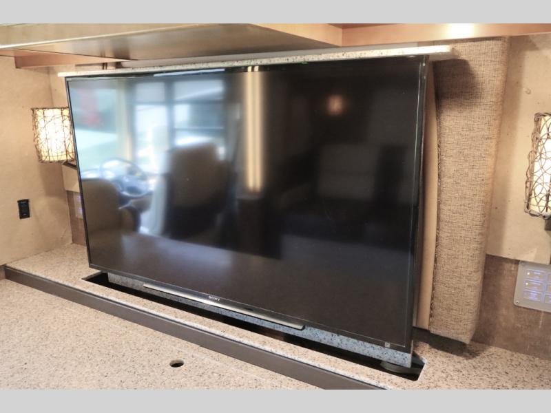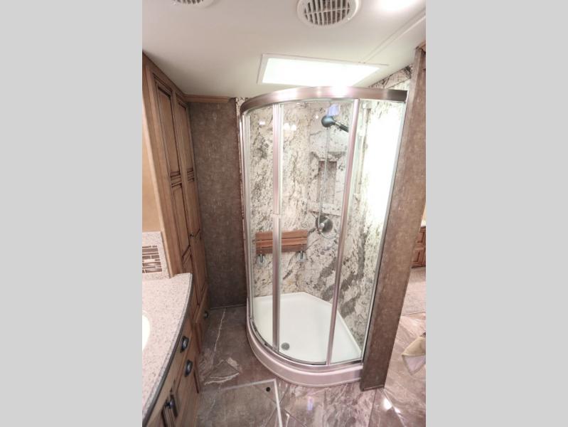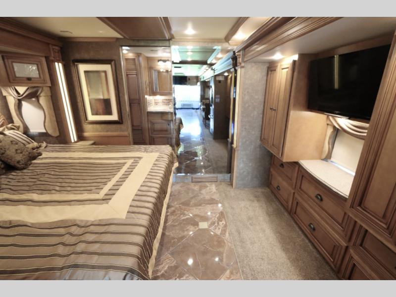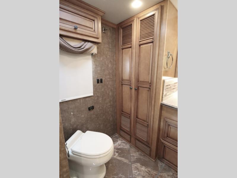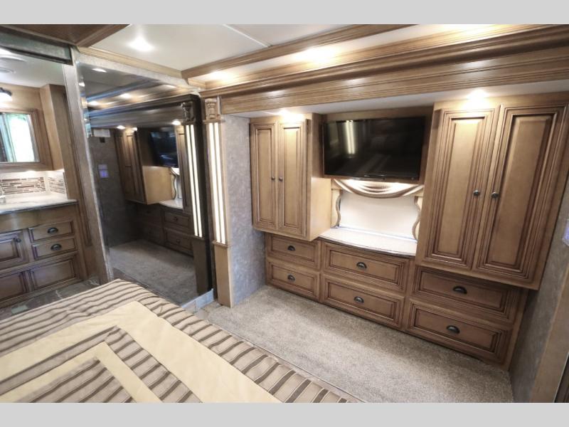 The rear bedroom offers a king bed slide. In the very rear of the motor home you will find a large master bath with a toilet, two wardrobes, sink, and corner shower. The full wall slide has two wardrobes, a chest of drawers, overhead TV, pantry, refrigerator, hide-a-leaf dinette, recliner, fireplace, and LED TV.