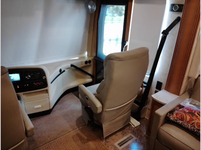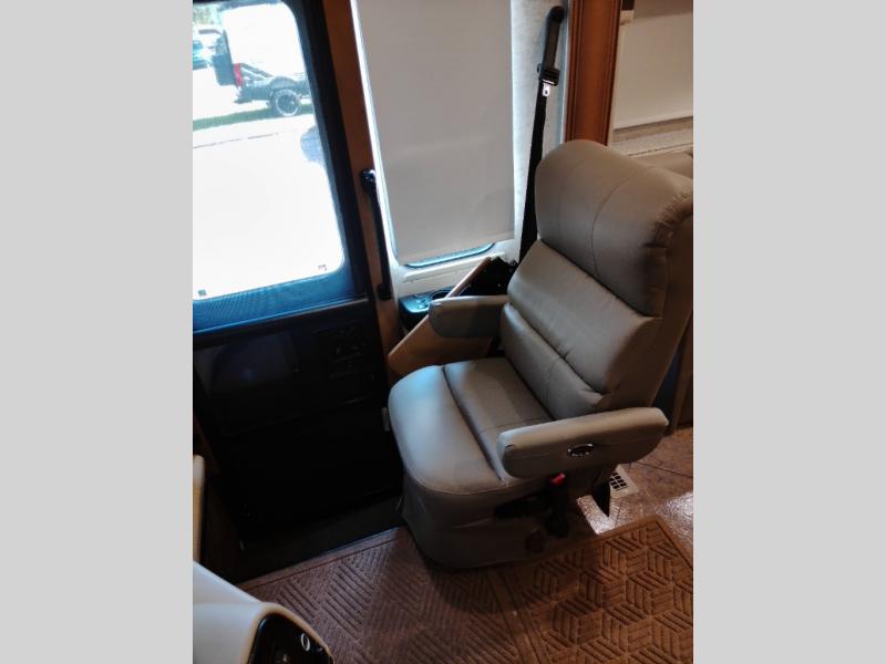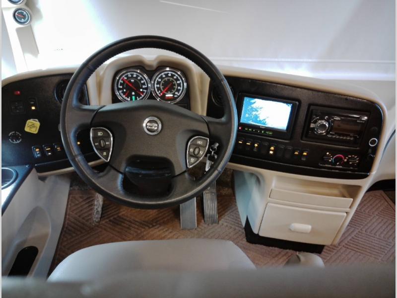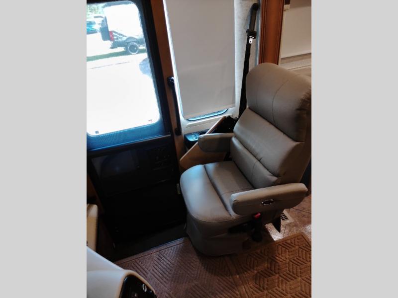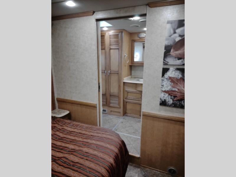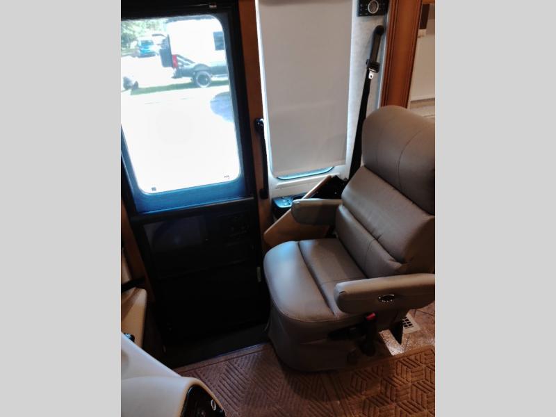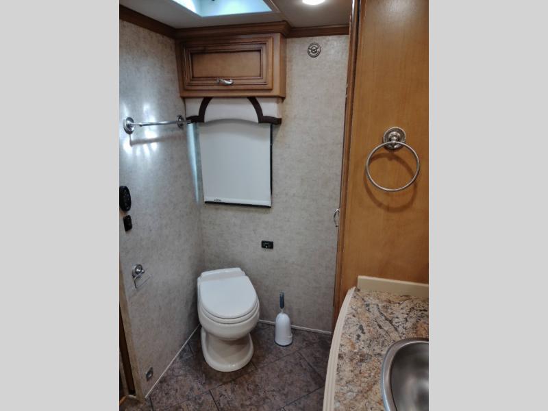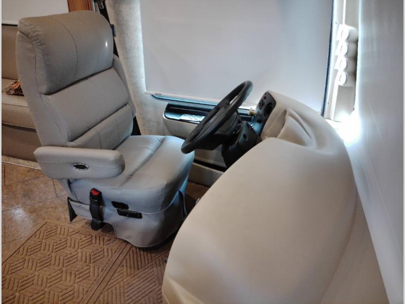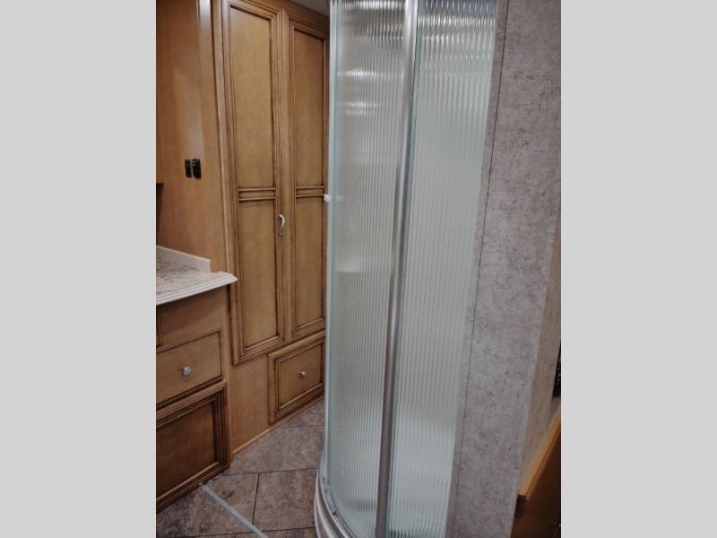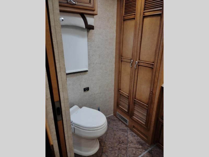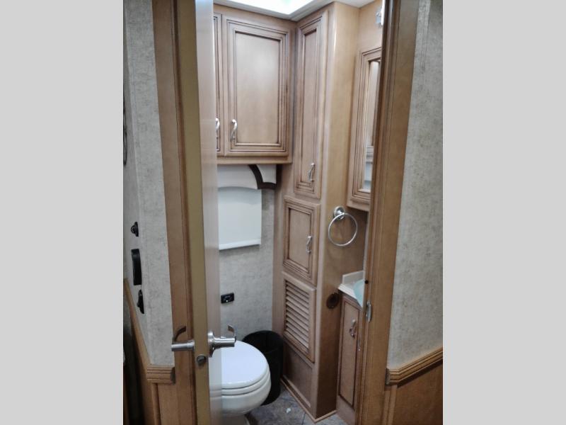 Both the driver and passenger seat swivel around to provide additional seating. Along one side of the motor home there is a slide with a 58" sofa and a booth dinette. Just around the corner from the dinette there is a half bath. On the opposite side of the motor home you will find a full wall slide with a jack-knife sofa, double kitchen sink, three burner range, refrigerator, pantry, two wardrobe, chest of drawers, and an overhead TV.