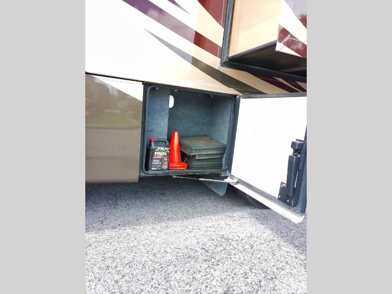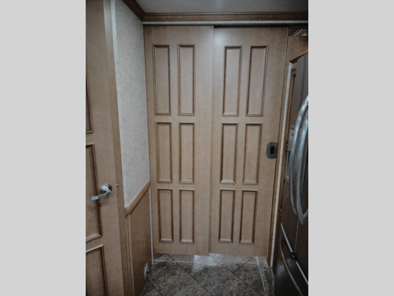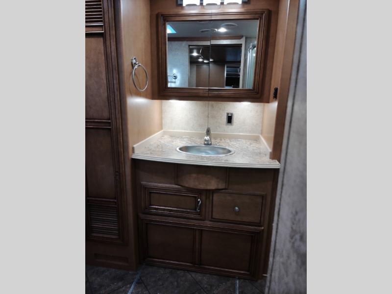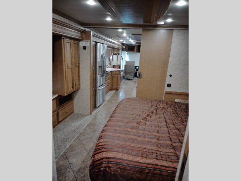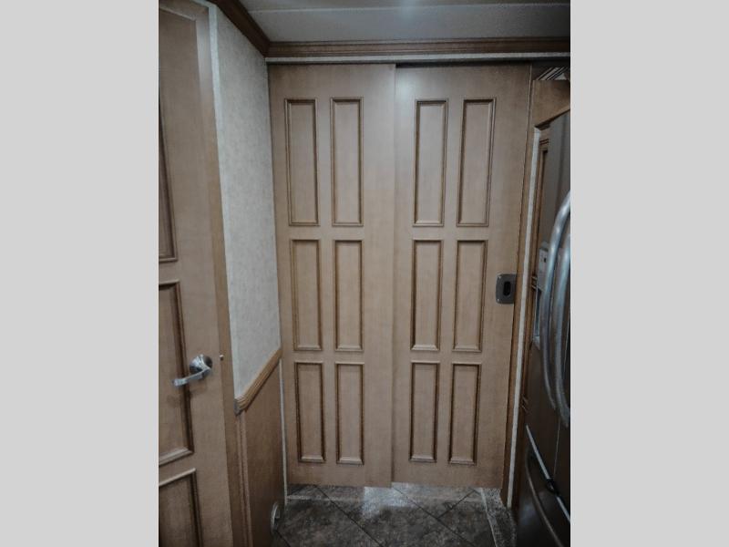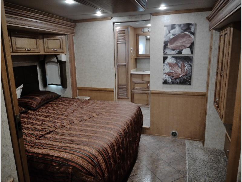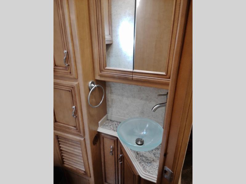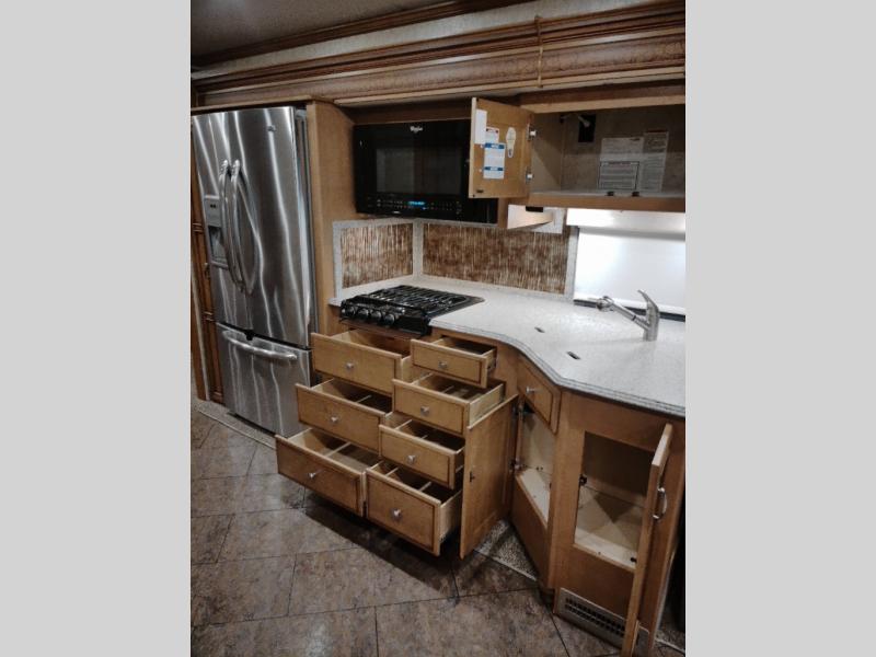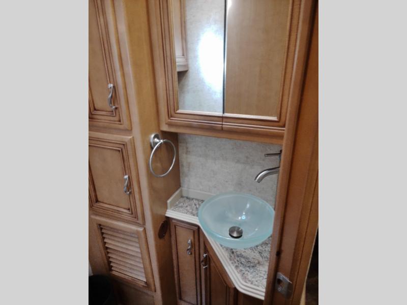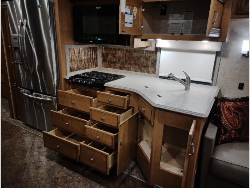 Both the driver and passenger seat swivel around to provide additional seating. Along one side of the motor home there is a slide with a 58" sofa and a booth dinette. Just around the corner from the dinette there is a half bath. On the opposite side of the motor home you will find a full wall slide with a jack-knife sofa, double kitchen sink, three burner range, refrigerator, pantry, two wardrobe, chest of drawers, and an overhead TV.