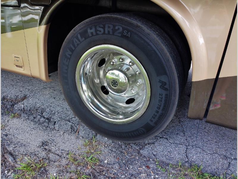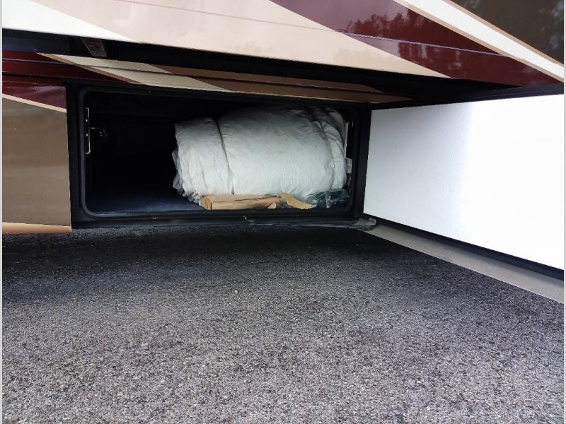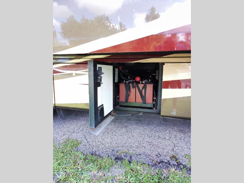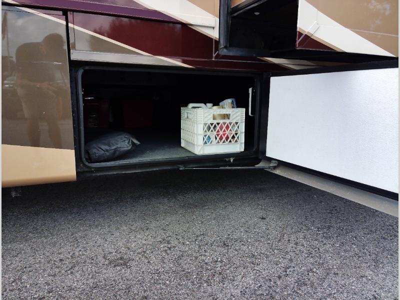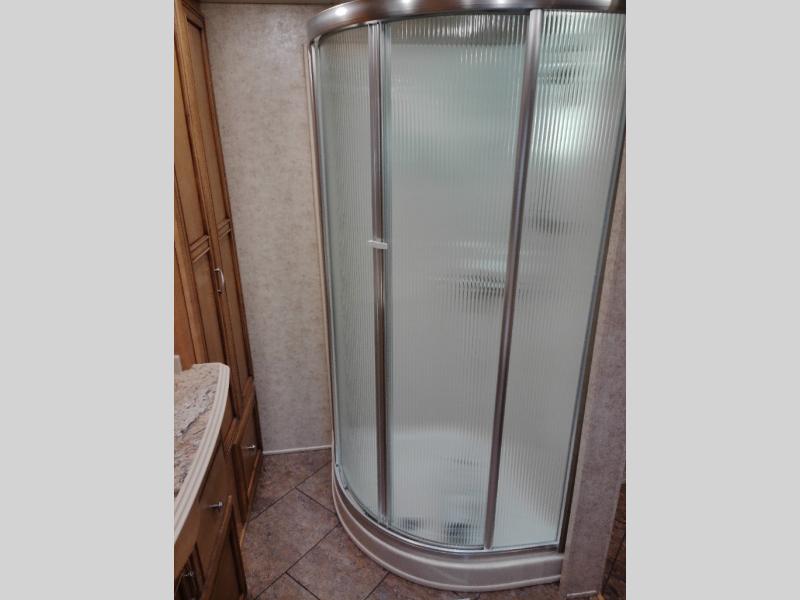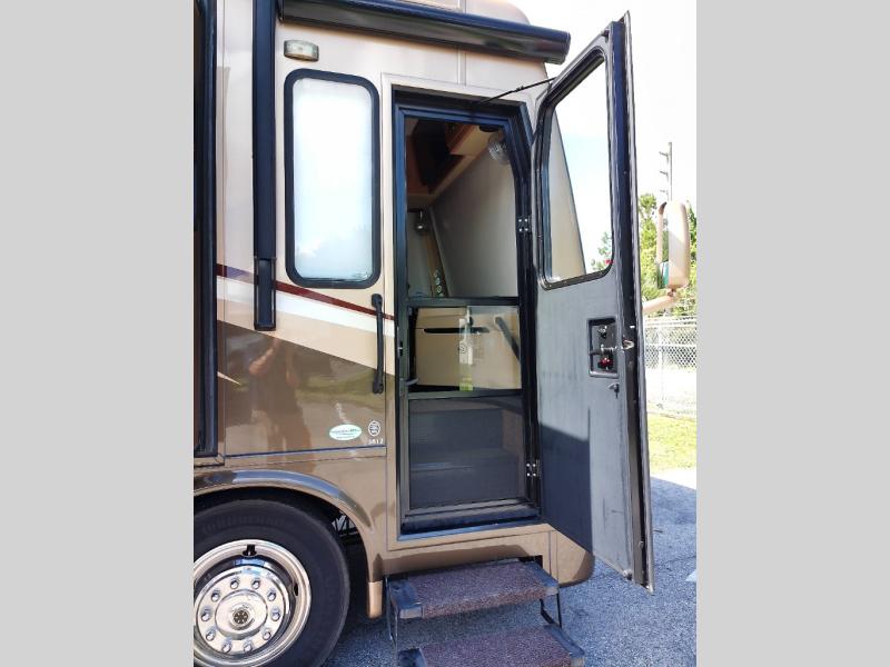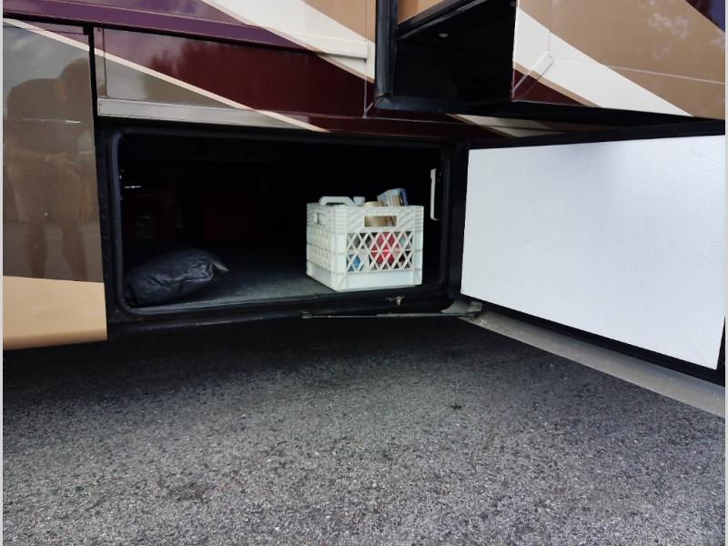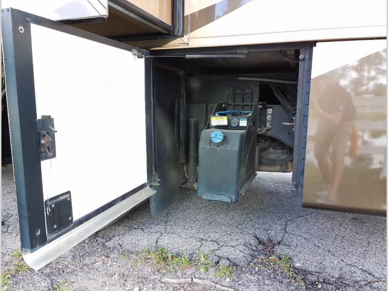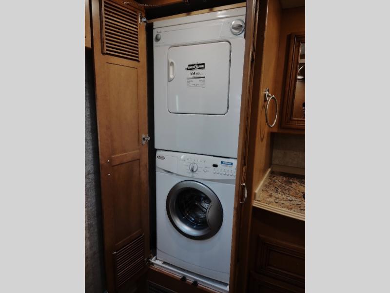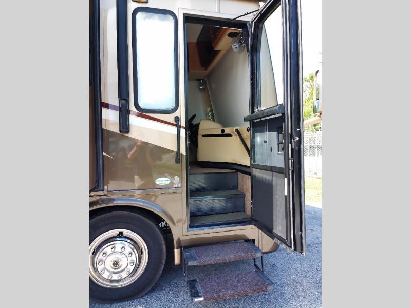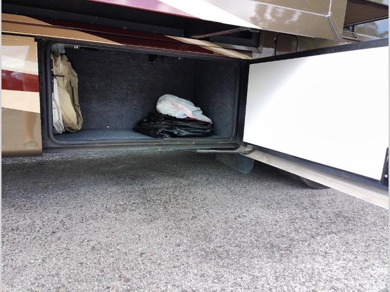 Both the driver and passenger seat swivel around to provide additional seating. Along one side of the motor home there is a slide with a 58" sofa and a booth dinette. Just around the corner from the dinette there is a half bath. On the opposite side of the motor home you will find a full wall slide with a jack-knife sofa, double kitchen sink, three burner range, refrigerator, pantry, two wardrobe, chest of drawers, and an overhead TV.