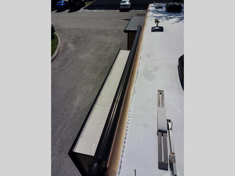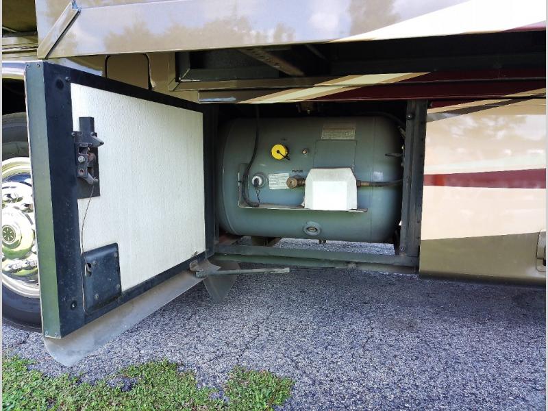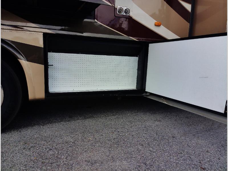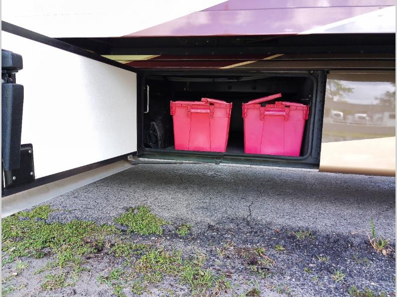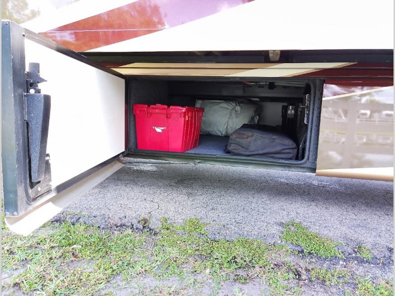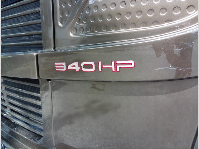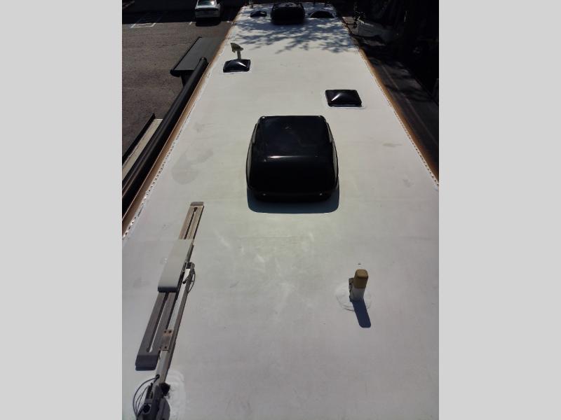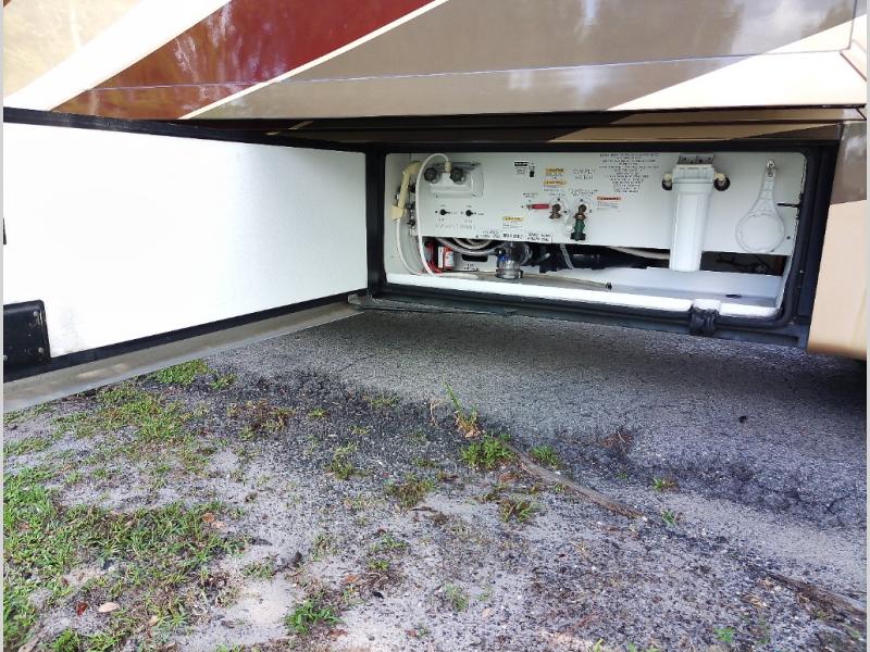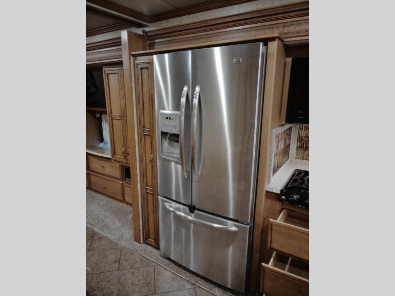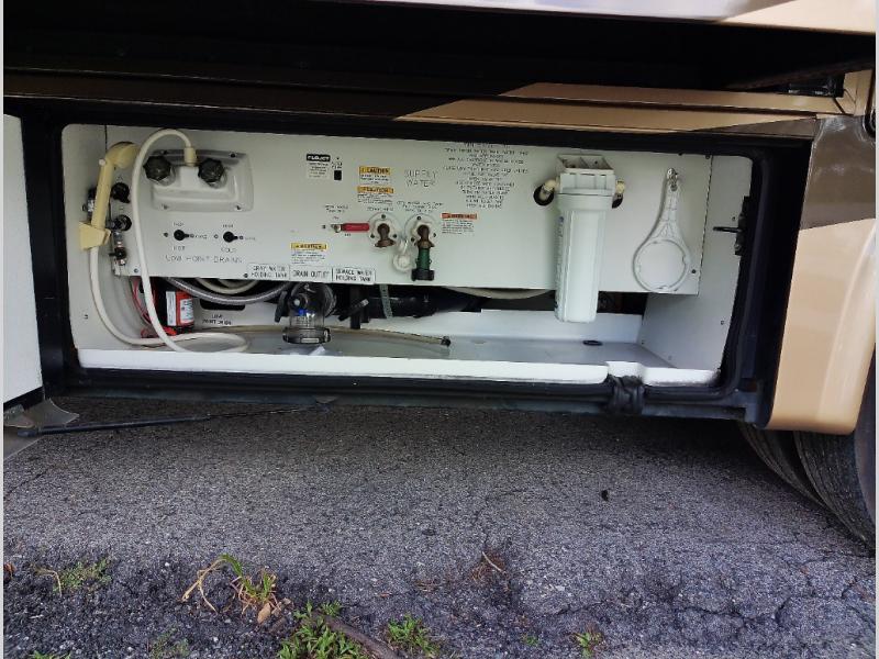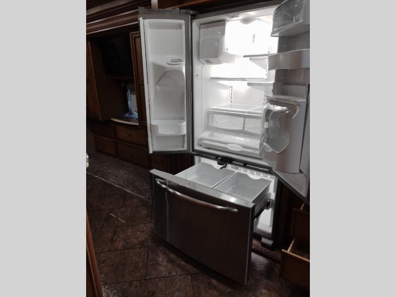 Both the driver and passenger seat swivel around to provide additional seating. Along one side of the motor home there is a slide with a 58" sofa and a booth dinette. Just around the corner from the dinette there is a half bath. On the opposite side of the motor home you will find a full wall slide with a jack-knife sofa, double kitchen sink, three burner range, refrigerator, pantry, two wardrobe, chest of drawers, and an overhead TV.
