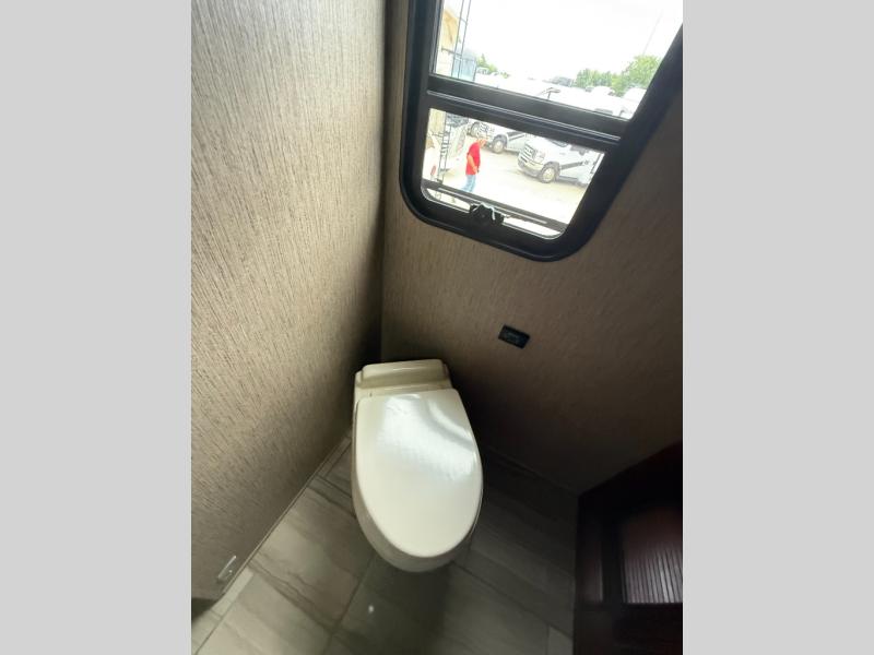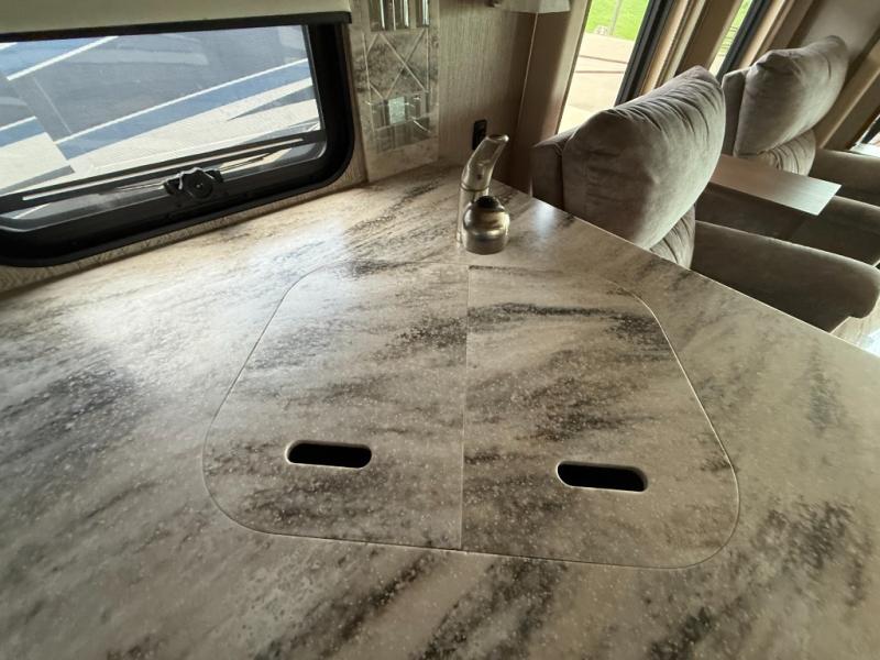 Both the driver and passenger seat easily swivel around to provide more seating in the living area. On the curb side of the motor home you will find a jack-knife sofa, and booth dinette slide.