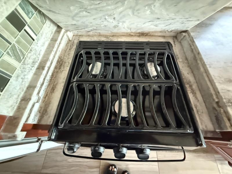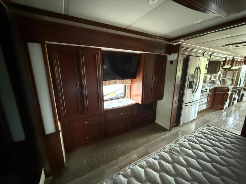 As you enter the motor home, the full wall slide has a hide-a-bed sofa, large sink, three burner range, refrigerator, pantry, two wardrobes, chest of drawers, and overhead TV.