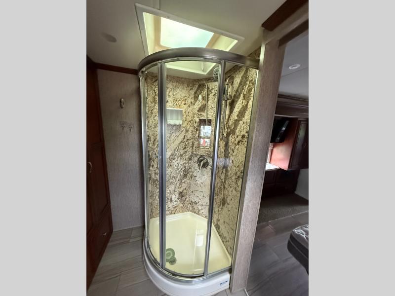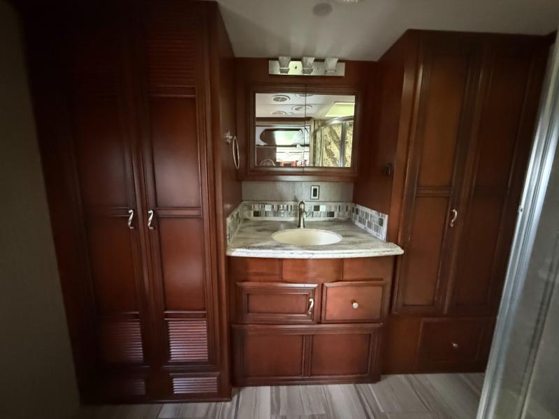 The rear bedroom has a king bed slide with nightstands on either side of the bed. Off of the bedroom there is a large master bath with a 36" shower, wardrobe with bi-fold doors, sink, wardrobe or washer and dryer, and toilet.