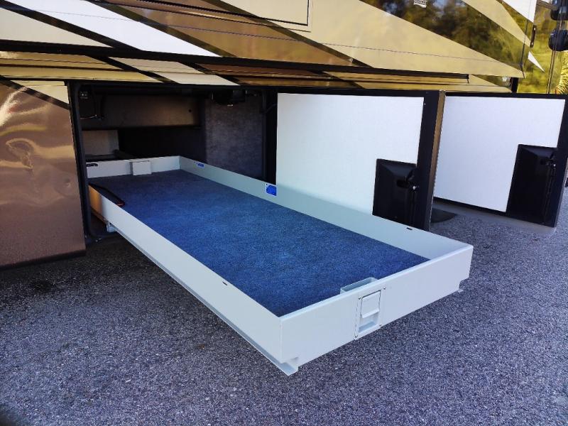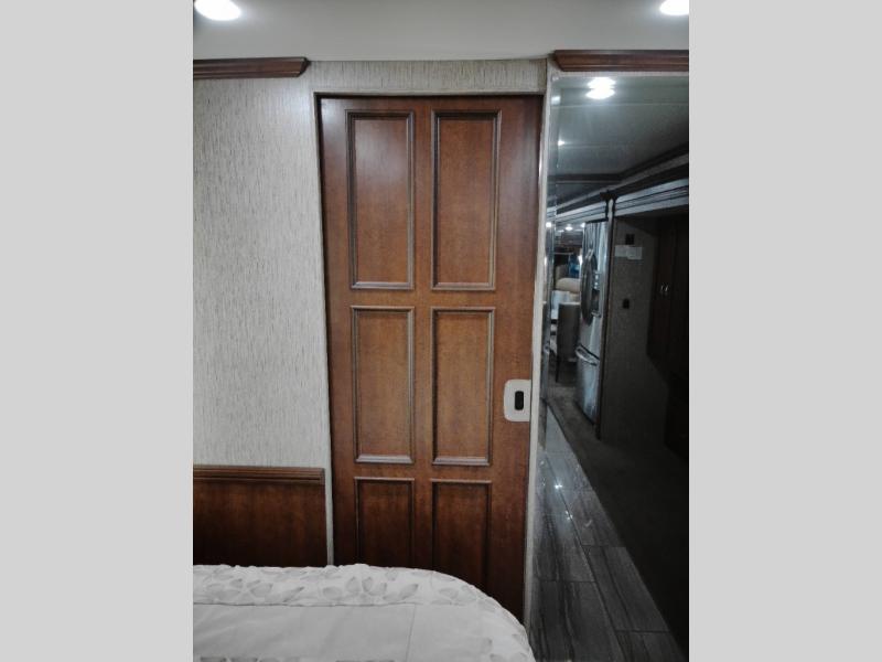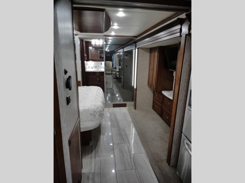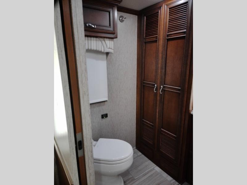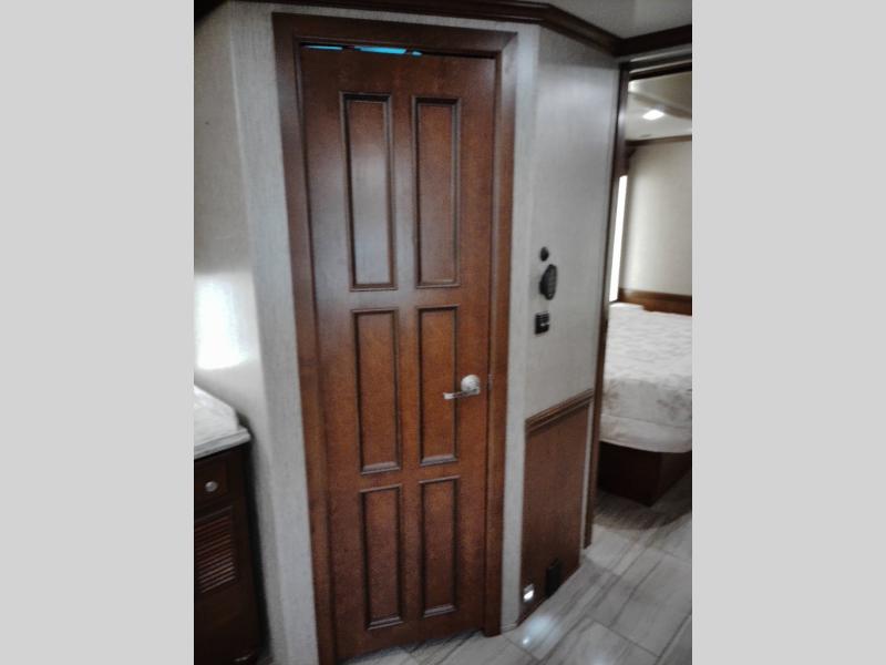 The half bath is down the hall. The rear bedroom has a king bed slide. The master bath offers a toilet, sink, wardrobe, and corner shower. There is a full wall slide with two wardrobes, a chest of drawers, overhead TV, pantry, refrigerator, booth dinette, and hide-a-bed sofa.