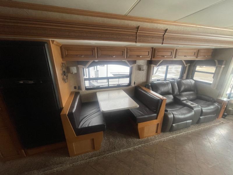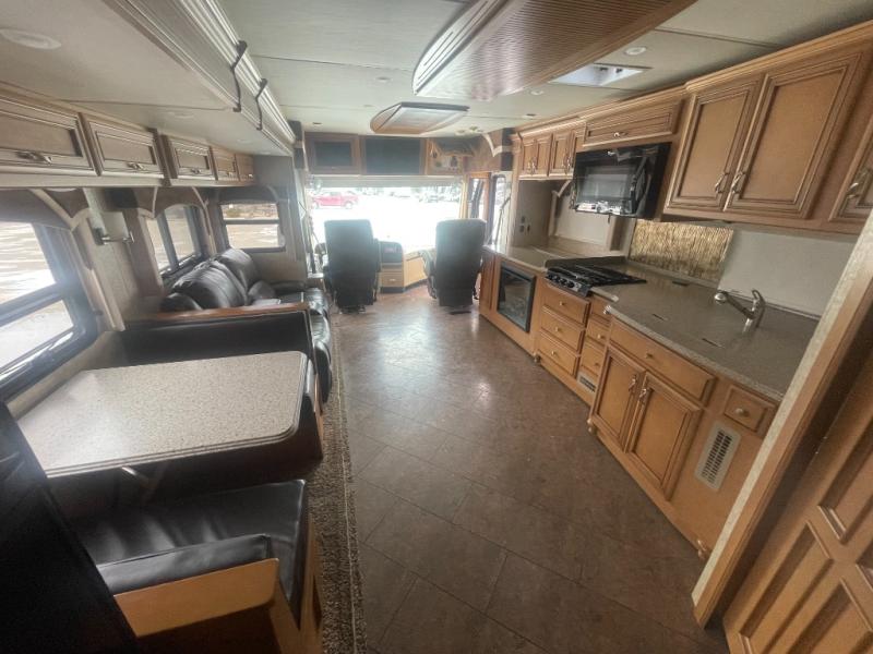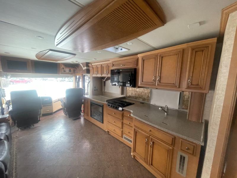 Along one side of the motor home there is a slide with a LED TV on a power lift, three burner range, and double kitchen sink. The opposite side of the motor home has a slide with a 68" hide-a-bed sofa, booth dinette, refrigerator, pantry, two wardrobes in the bedroom, a chest of drawers, and an overhead TV.