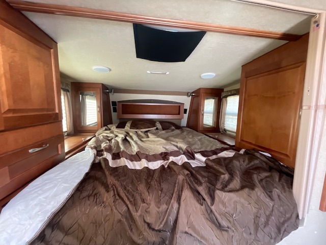 Step up to the front bed with two wardrobes and a hamper at each side, space for an optional TV with a swing arm, along with a shelf above the head of the bed.
