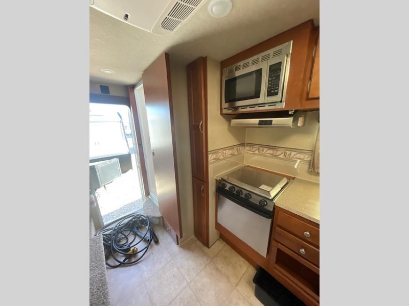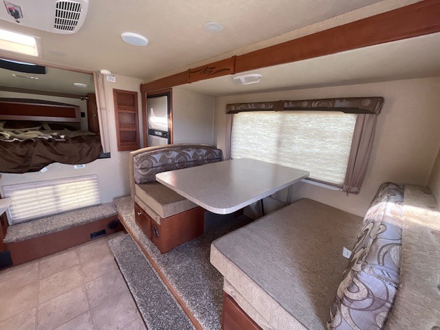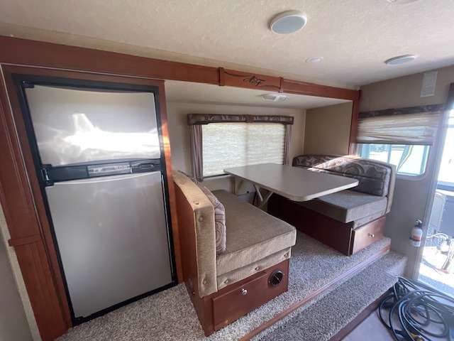 Across, take one step up to the slide out including a booth dinette with an optional overhead bunk and a refrigerator.